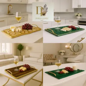 The Designer Geode Crystal Tray Collection by Dolly Lopez redefines luxury homeware by combining functional elegance with spiritual design. Each serving tray is a handcrafted masterpiece, created with high-gloss epoxy resin, shimmering metallic pigments, and an opulent selection of authentic crystals—including amethyst, agate, clear quartz, and tiger eye.