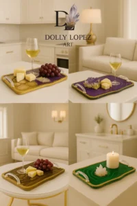 Combined with the fluid shapes and golden details of resin geode design, each tray becomes a vibrational artwork—radiating energy while impressing guests with its elegance.