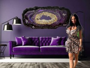 A luxurious wall sculpture crafted with shimmering crystals, minerals, and epoxy resin, designed to bring positive energy, elegance, and a spiritual essence into high-end interiors. The amethyst geode symbolizes protection, peace, and abundance, making it not only decorative but meaningful.