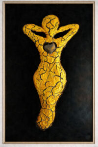 The sculpture exhibited at Arte Firenze represents the female form as a symbol of strength, transformation, and inner power. The body of the sculpture is created using a special surface technique made from crackle paste and gypsum (plaster), which produces an organic cracked texture across the surface.