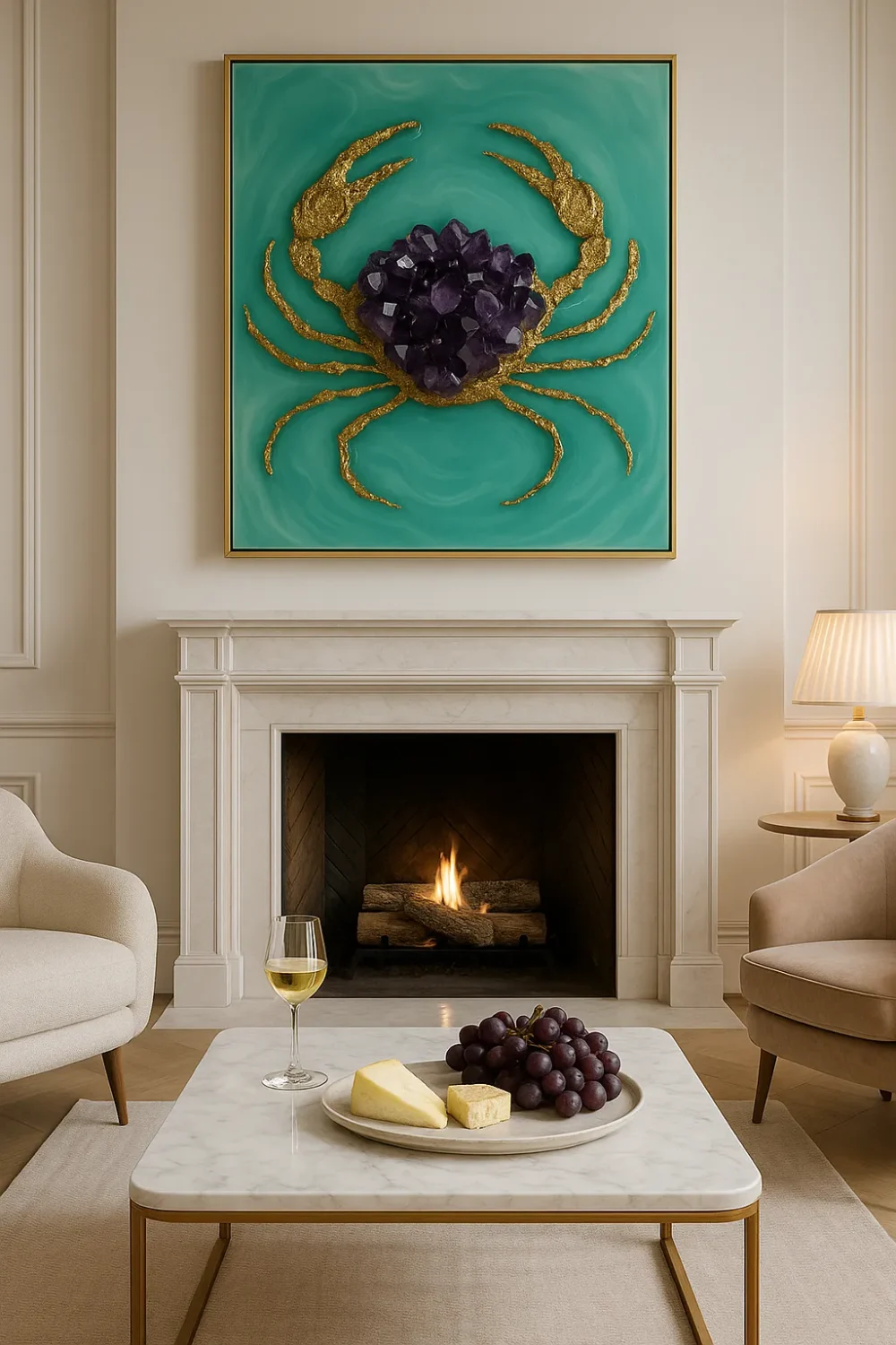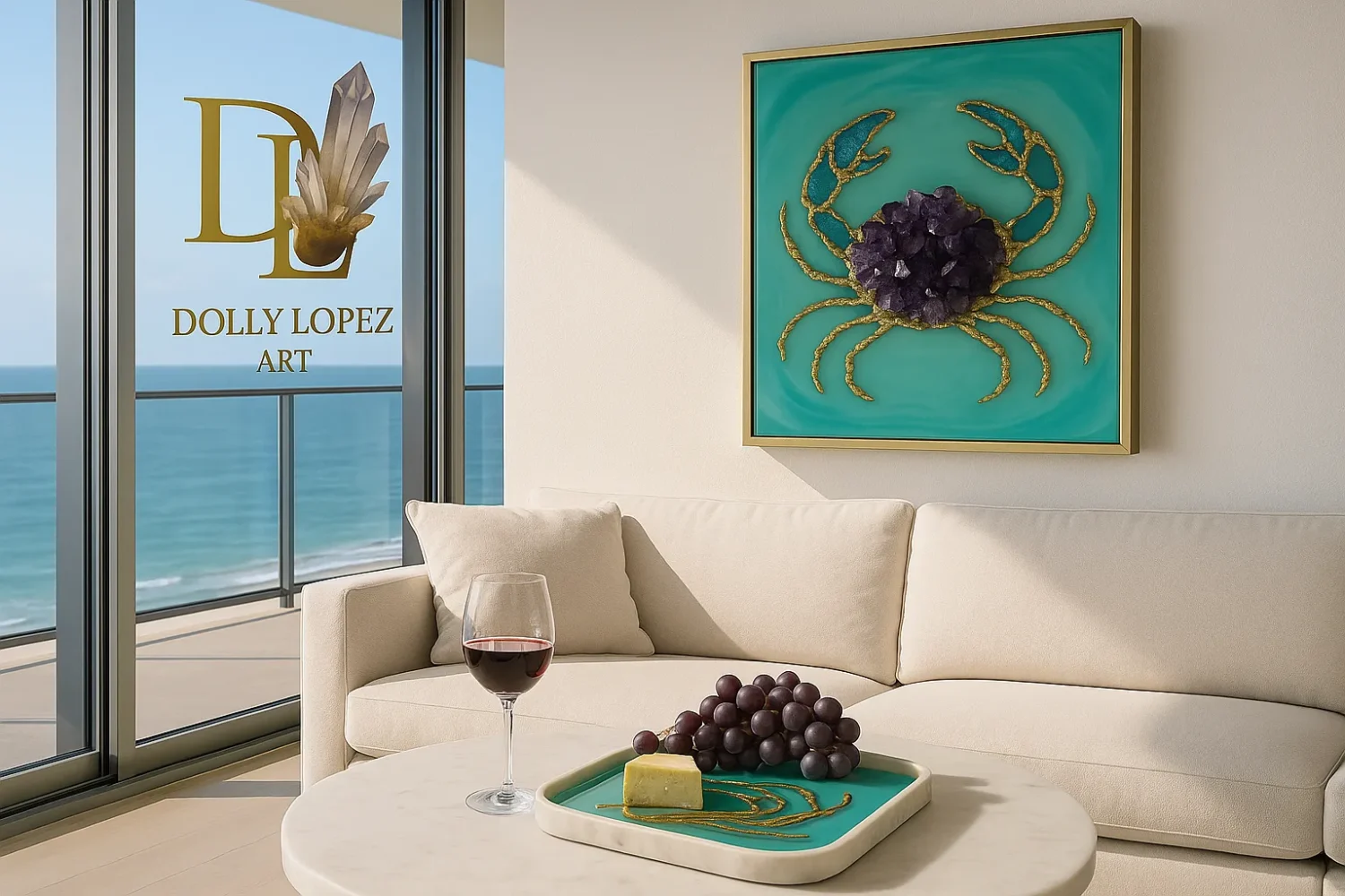 Transform your space with the bold elegance of the Amethyst Crab, a one-of-a-kind wall sculpture by contemporary resin artist Dolly Lopez. This luxury epoxy resin artwork features a powerful amethyst crystal cluster as the heart of the crab, surrounded by intricately sculpted 24K gold-coated legs, all set against a serene, layered turquoise resin backdrop.