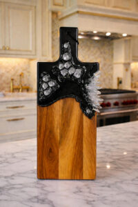 Handcrafted from high-quality acacai wood, this unique serving board features shimmering black metallic resin art, creating a luxurious, modern look.