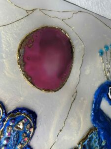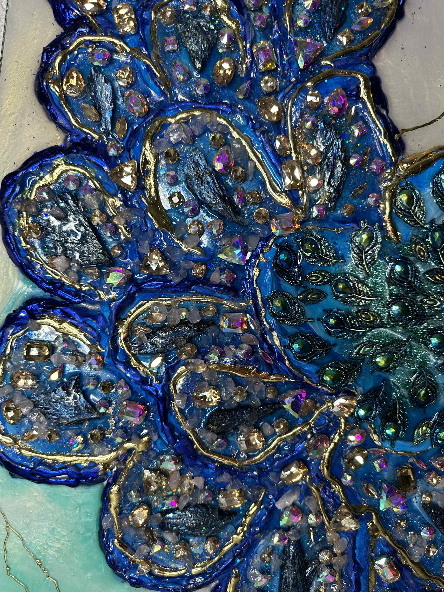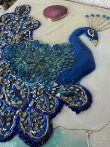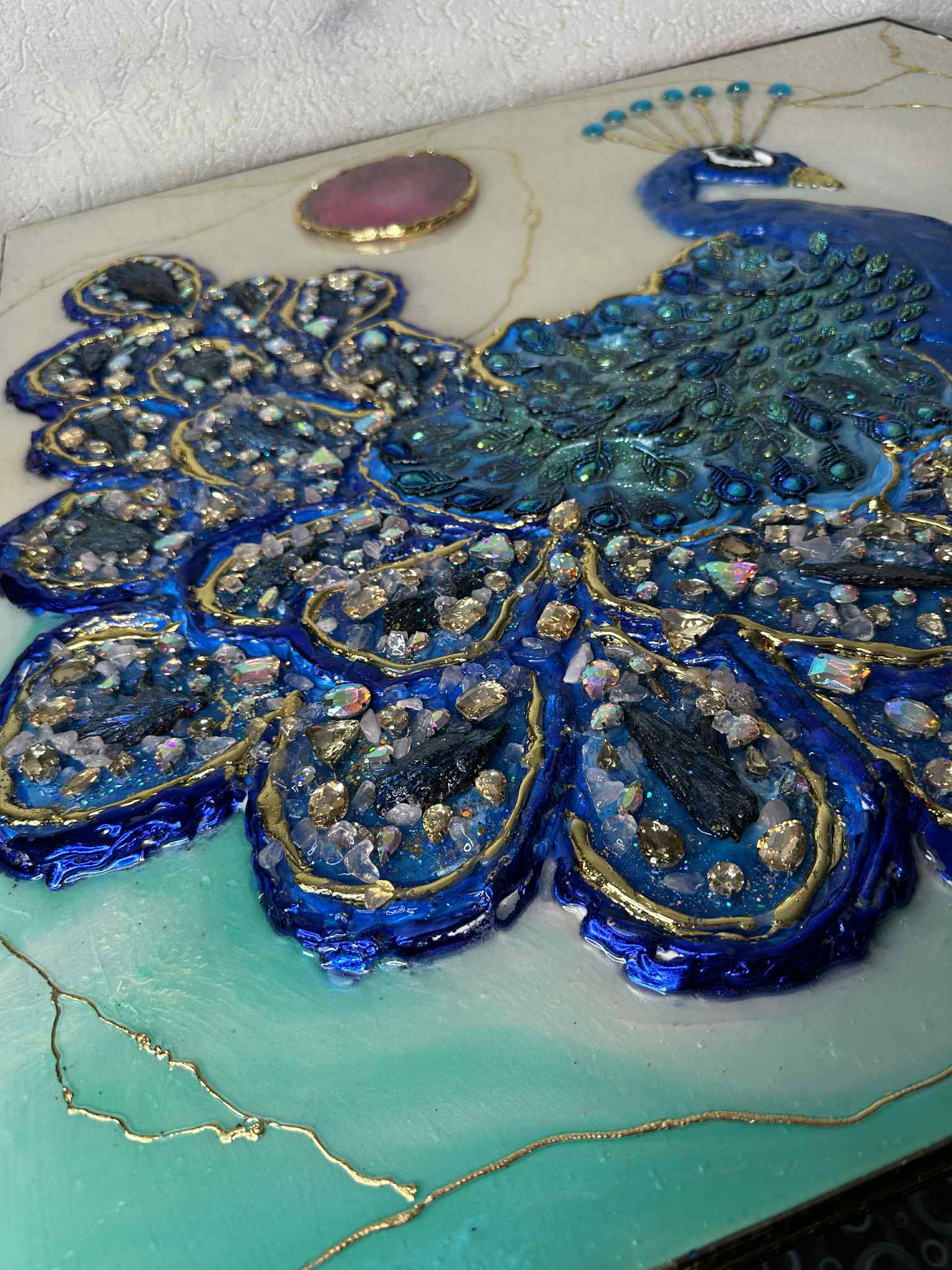 This one-of-a-kind Peacock Resin Artwork is infused with 3 real healing gemstones: