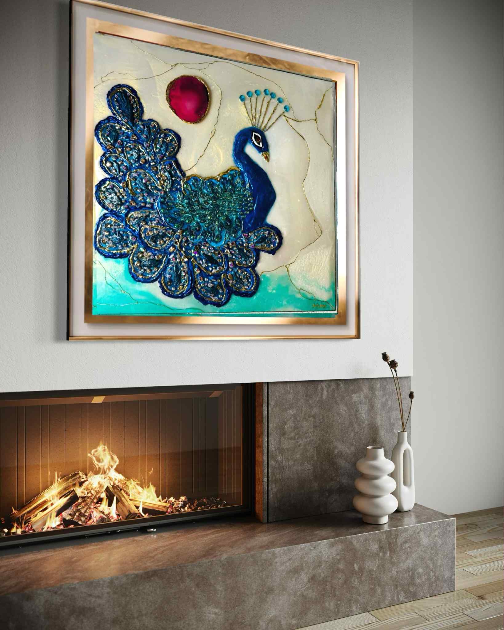 Infuse your interior with royalty, intuition, and high-frequency energy with this luxurious Peacock Wall Sculpture by Dolly Lopez. Lovingly handcrafted on an 80×80 cm natural wood panel, this radiant piece features shimmering blue kyanite crystals, layered blue mica pigments, and flowing textures sealed in high-quality resin—a celebration of divine beauty and soulful transformation.