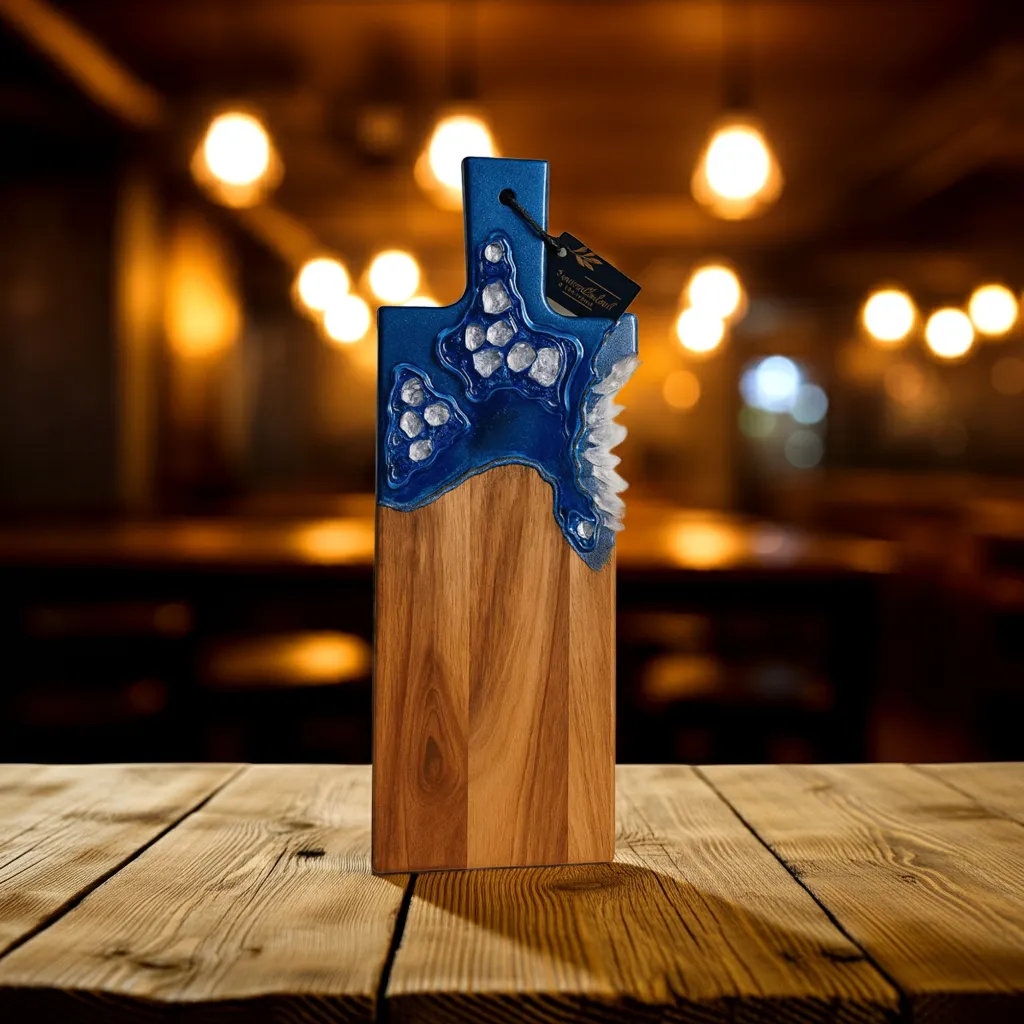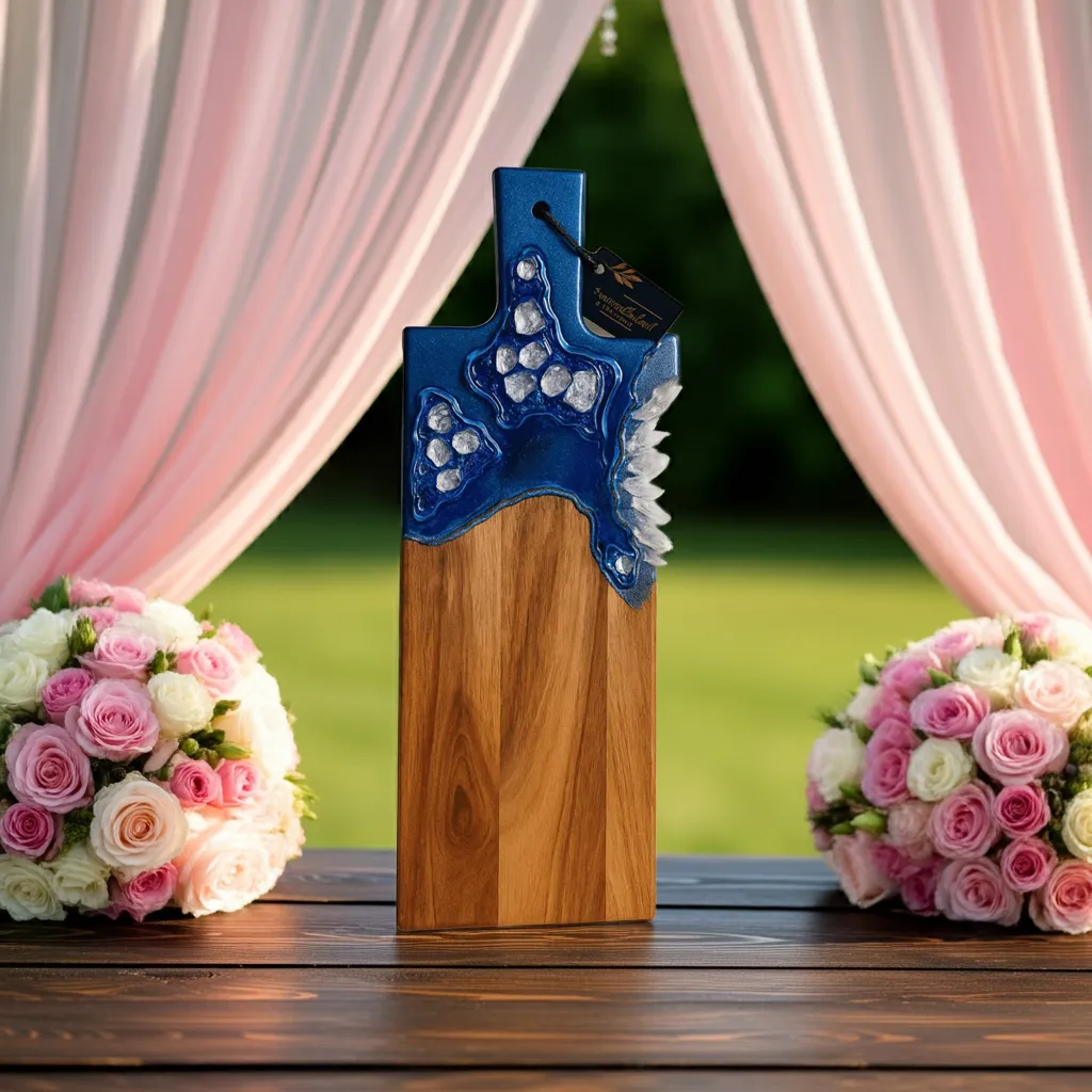 Bring a touch of elegance to your table with this stunning blue Metallic Acacia Wood Cutting board by Dolly Lopez Art.