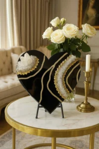 This heart-shaped sculpture is the embodiment of sacred elegance and energetic protection. With its glossy obsidian-like surface and shimmering crystal textures, it commands attention while emanating calm, clarity, and timeless strength.
