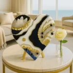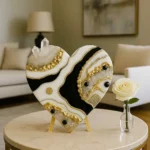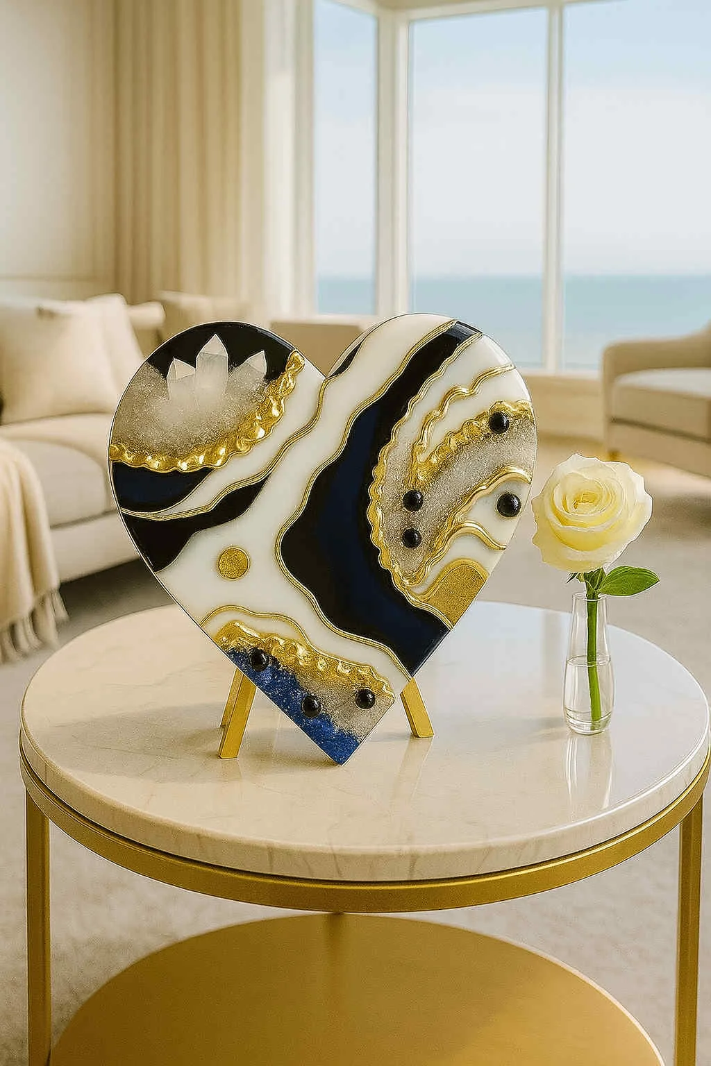 A luxurious heart-shaped creation by Dolly Lopez, made with high-gloss black and pearl-white epoxy resin, powerful clear quartz clusters, polished black obsidian, and radiant 24K gold leaf.