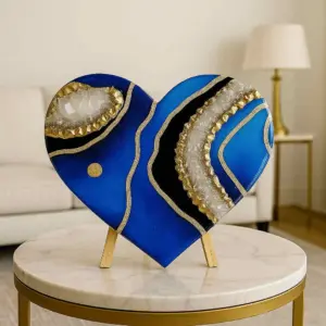 Handcrafted by Dolly Lopez, this breathtaking heart sculpture is created using deep ocean-blue epoxy resin, shimmering clear quartz crystals, sleek black accents, and hand-laid 24K gold detailing. It’s a portal to peace, truth, and divine serenity.