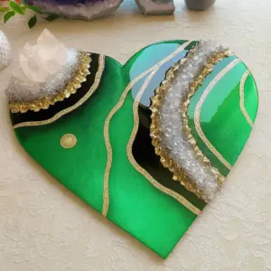 A vibrant handcrafted creation by Dolly Lopez, this heart-shaped sculpture is made with emerald green epoxy resin, genuine clear quartz crystals, deep black accents, and 24K gold leaf detailing. Each piece radiates harmony, healing, and grounding energy.
