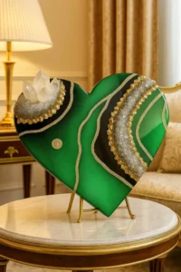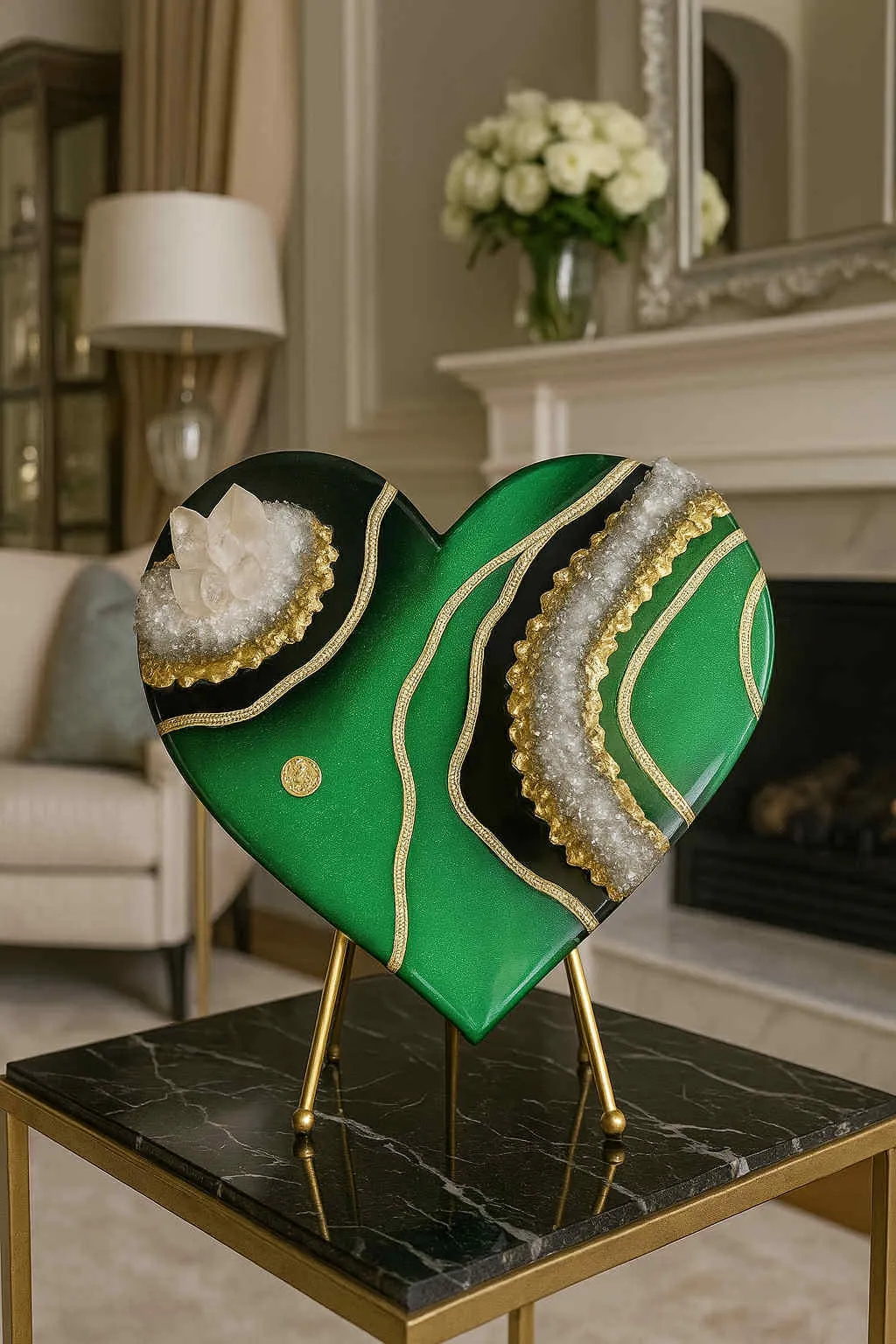 This lush green geode heart glows with vitality and light. Its multidimensional textures and crystalline composition make it a unique fusion of natural inspiration and luxury art. A perfect piece for homes that value both elegance and energetic harmony.