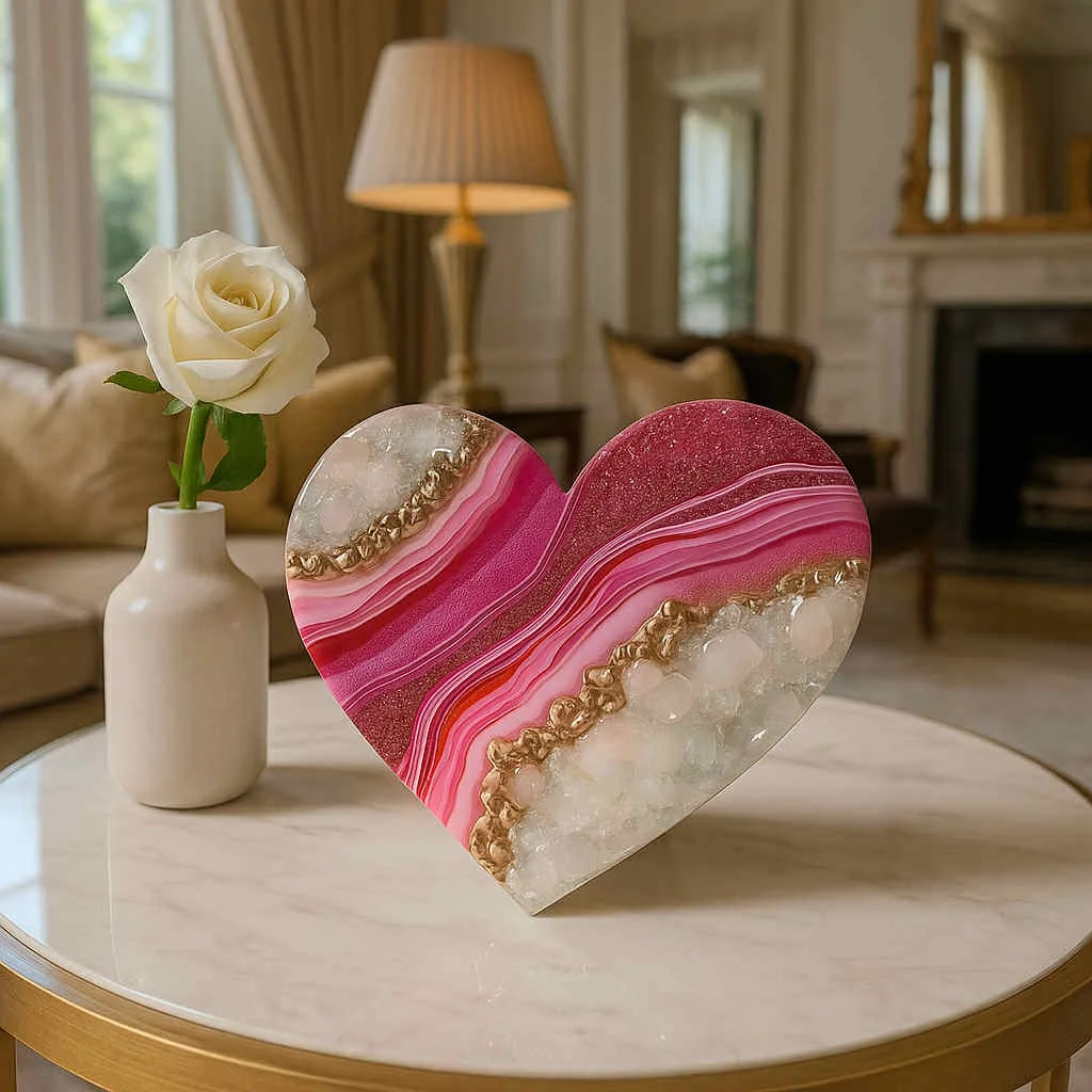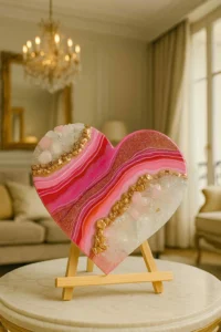 Handcrafted with care by Dolly Lopez, this heart-shaped masterpiece features vibrant pink resin, delicate rose quartz clusters, and luminous 24K gold leaf. Radiating feminine power, unconditional love, and emotional healing, this artwork is a celebration of the divine heart.