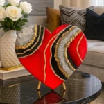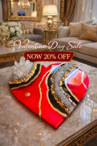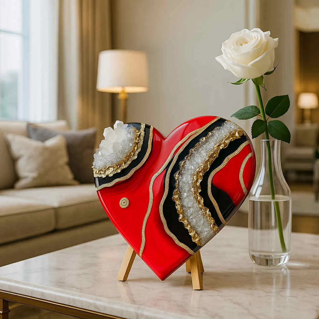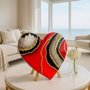 This striking heart-shaped sculpture is a symbol of fierce love, inner power, and elevated luxury. With vivid crimson resin, bold black accents, and cascading golden crystal veins, it brings passion, elegance, and metaphysical strength into your sacred space.