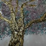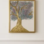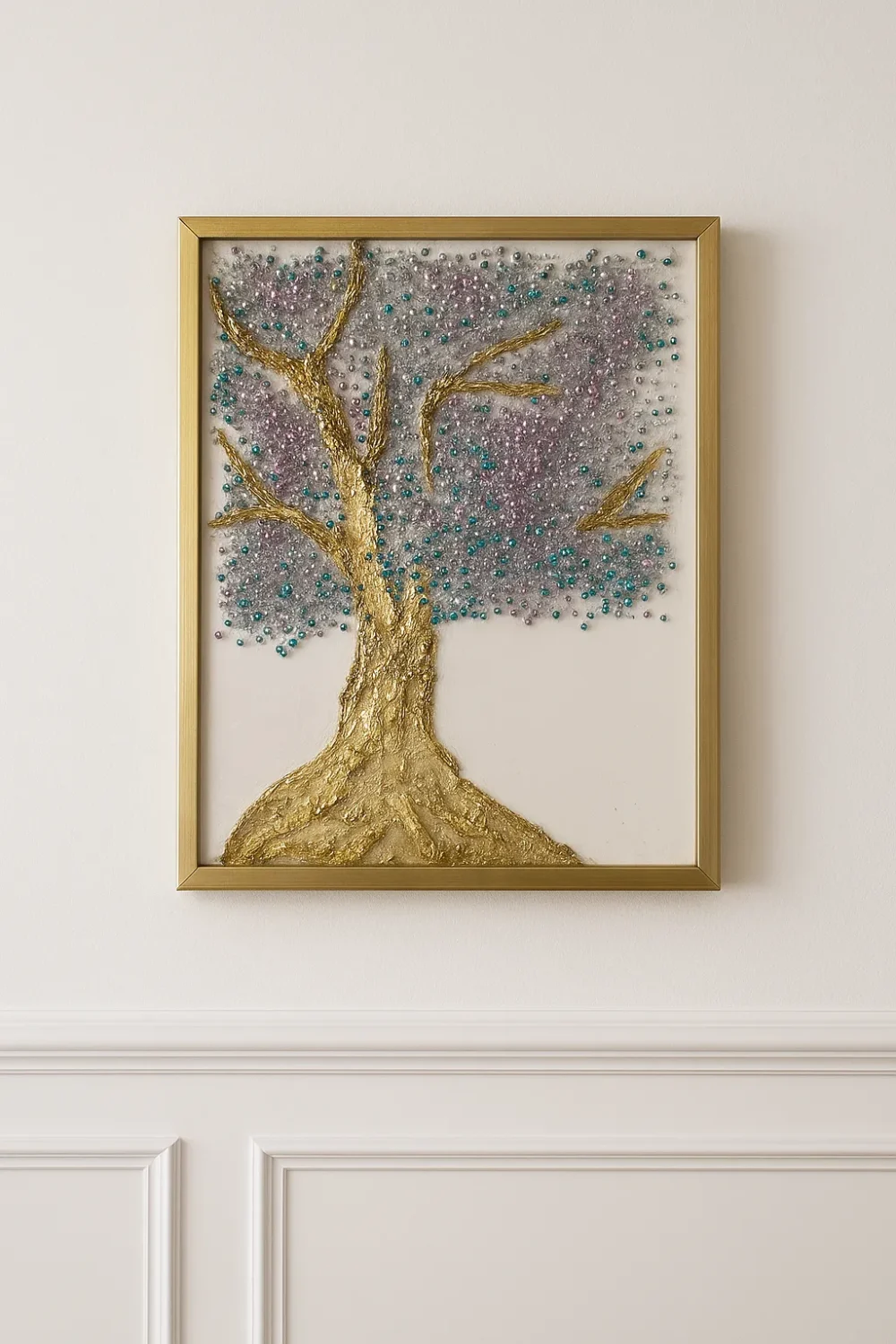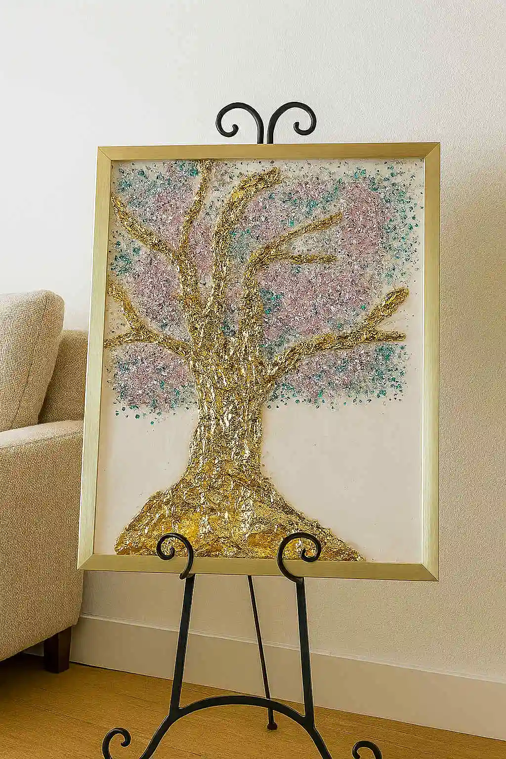 Step into the energy of divine expansion with Divine Bloom, a one-of-a-kind crystal wall sculpture by Dolly Lopez. Hand-poured with shimmering epoxy resin on a natural wood panel, this radiant artwork features a blossoming tree crowned with soft pink and light blue crystals, rooted in sculpted 24K gold leaf. Like a sacred tree of life, this piece embodies growth, spiritual wisdom, and blooming beauty.