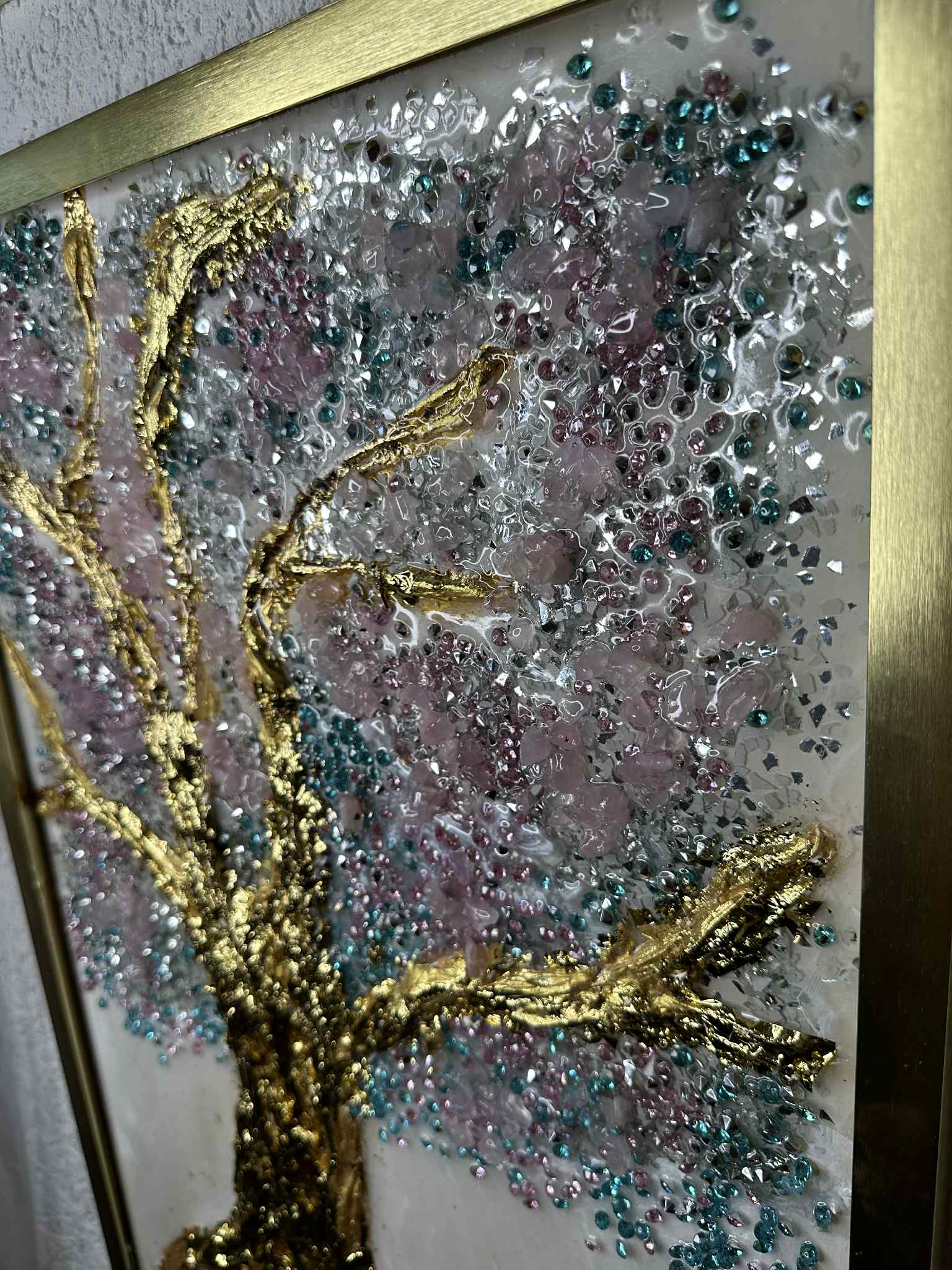 Divine Bloom Wall Art – Handcrafted with Light Rosa Quartz Crystals, 24K Gold & Epoxy Resin 60 *41 cm