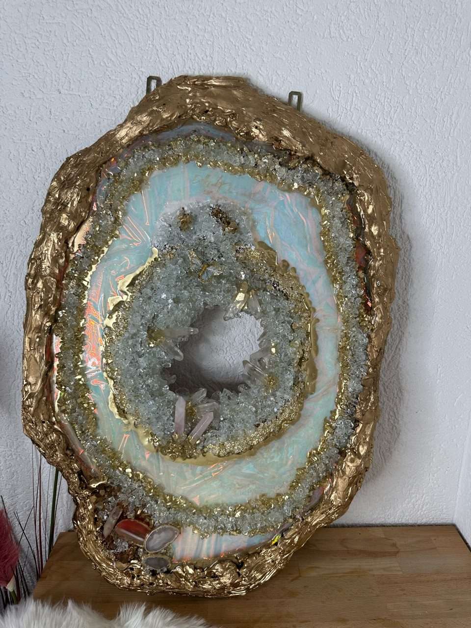 SEO keywords: rainbow quartz, crystal art, positive energy decor, healing stone, spiritual home decor, colorful quartz resin art