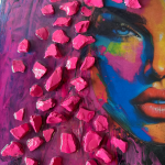 Pink hues flow across the canvas like blush on her skin, symbolizing passion, warmth, and allure. Shades of blue weave through, suggesting a depth of spirit, calm intensity, and the secrets she holds just beyond reach. Meanwhile, vivid accents of yellow infuse the piece with an aura of vitality and confidence, bringing brightness to her gaze and adding a touch of mystery to her sensuality. These colors are more than visual elements; they represent the multifaceted nature of femininity — tender yet resilient, inviting yet untouchable.