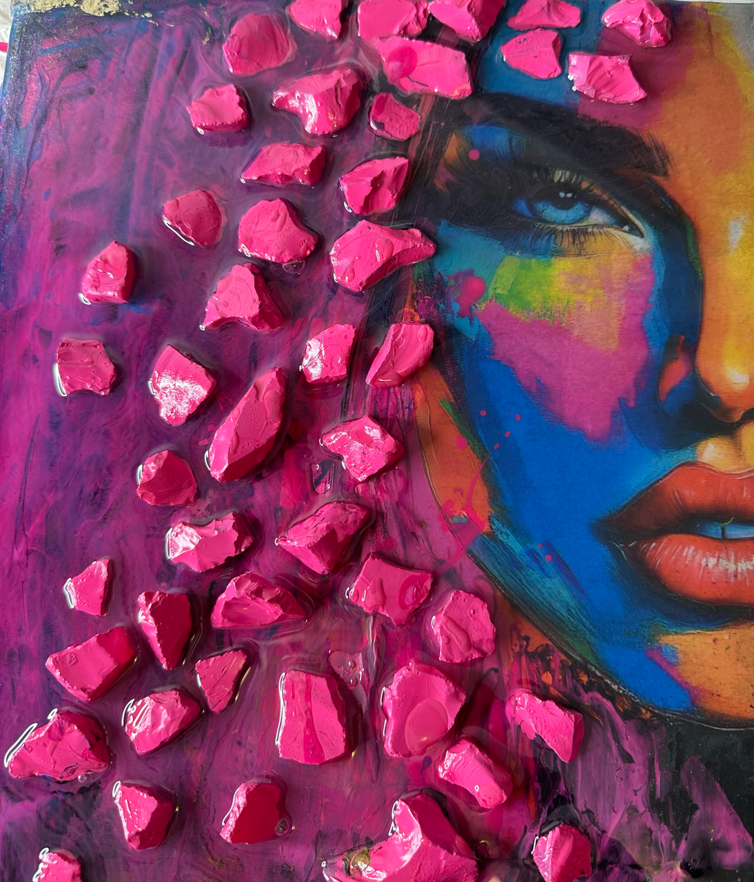 The Femme Fatale collection is an ode to sensuality, power, and the enigmatic allure of the feminine spirit. Through a sophisticated blend of mixed media and epoxy resin, this piece uses the seductive colors of pink, yellow, and blue to evoke a sense of confidence and intrigue. Each layer of this artwork captures the essence of a woman who is both captivating and mysterious, embodying the timeless allure of the femme fatale.