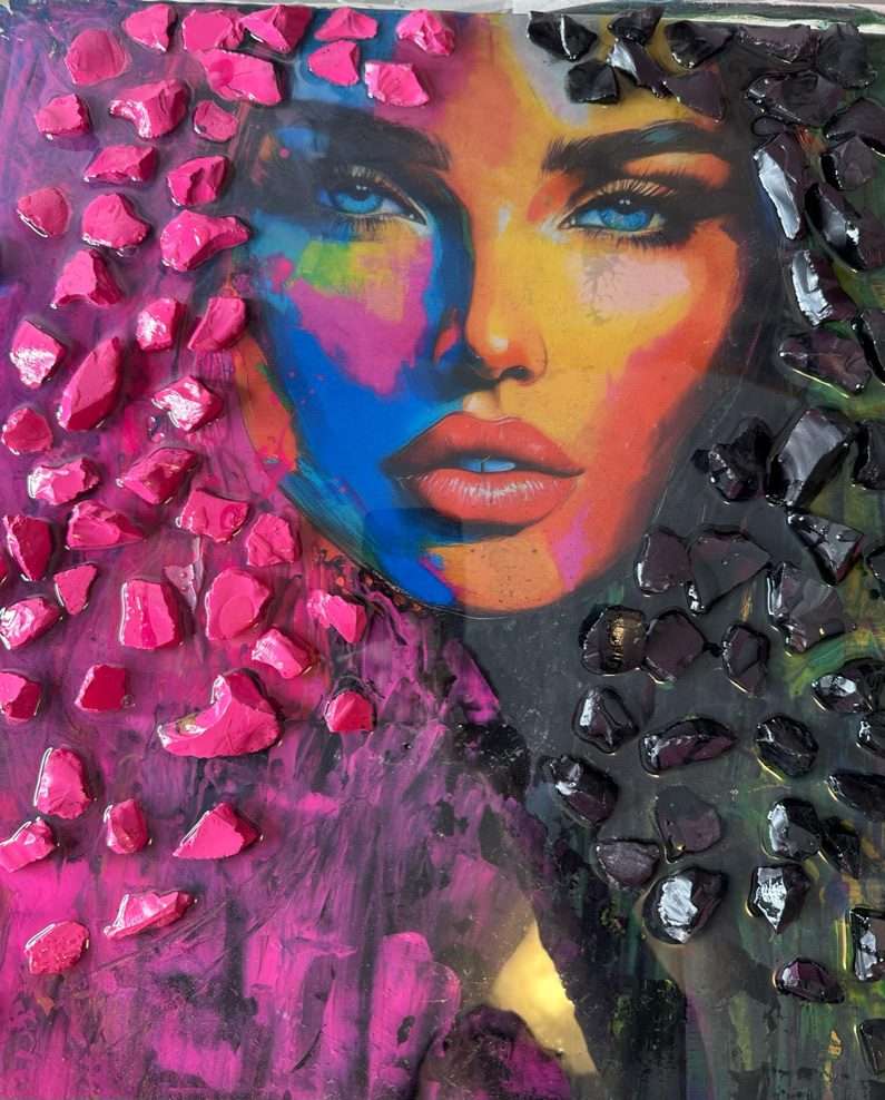 The epoxy resin serves as a translucent veil over this woman’s form, enhancing each color’s vibrancy while creating a glossy, liquid depth that draws viewers into her world. Light reflects off the epoxy, adding dimension and movement to the piece, making her appear alive, her eyes seemingly following the viewer as if hiding secrets in their glow. The resin also serves to magnify every detail, emphasizing the graceful contours and expressive textures of the mixed media beneath, creating an effect as captivating as the femme fatale herself.