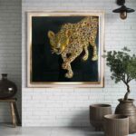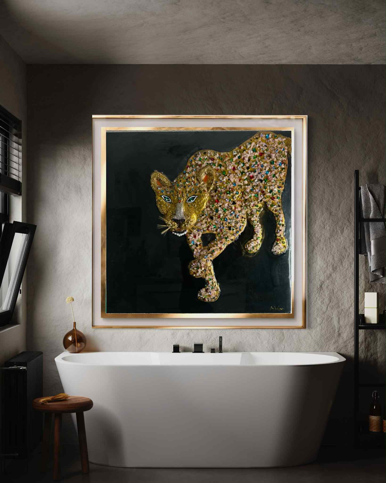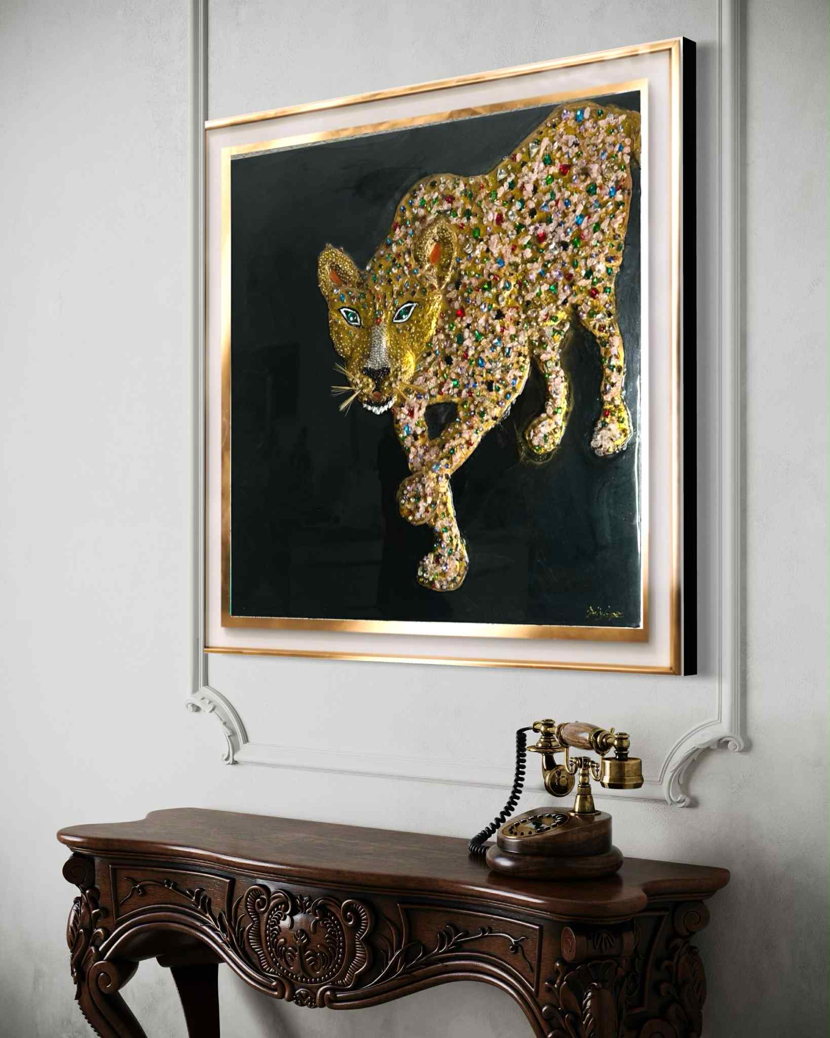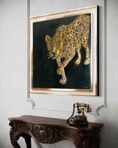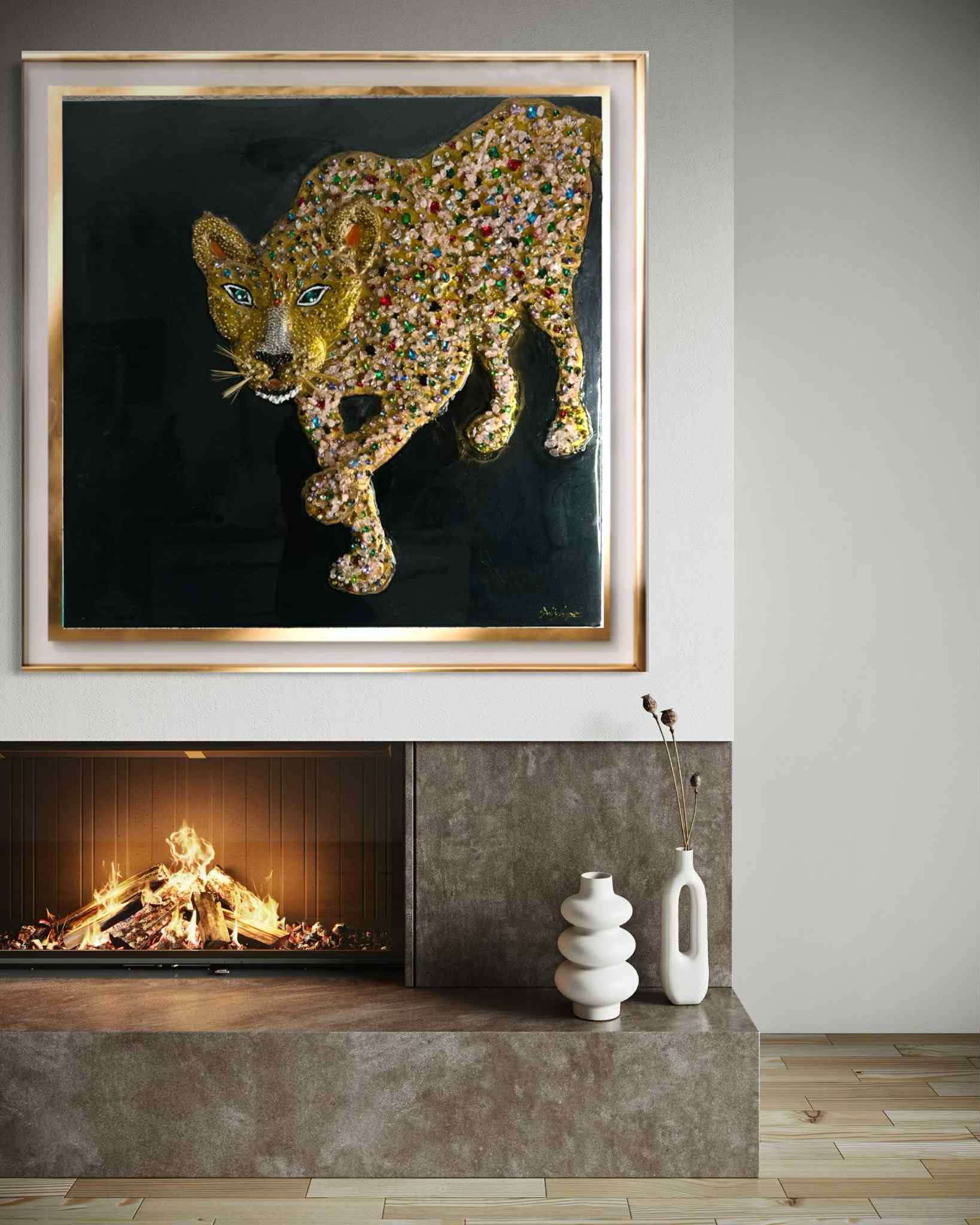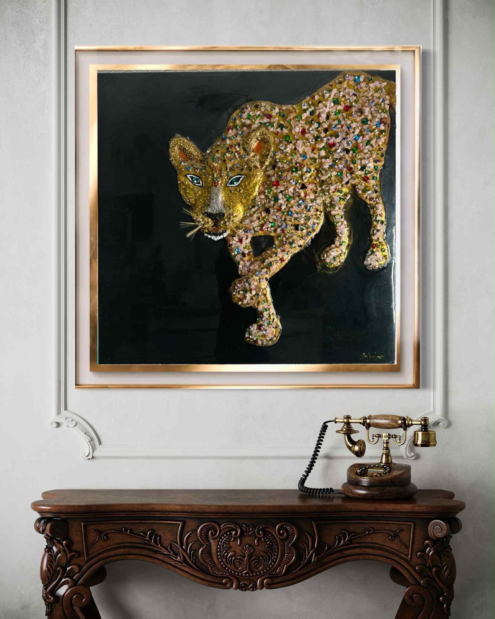 Unleash the spirit of the wild with ” Jewel Leopard”, an extraordinary resin art sculpture that blends power, elegance, and luxury. This 3D mixed-media artwork features a golden leopard encrusted with colorful gemstones and natural quartz teeth, symbolizing strength, resilience, and raw beauty.