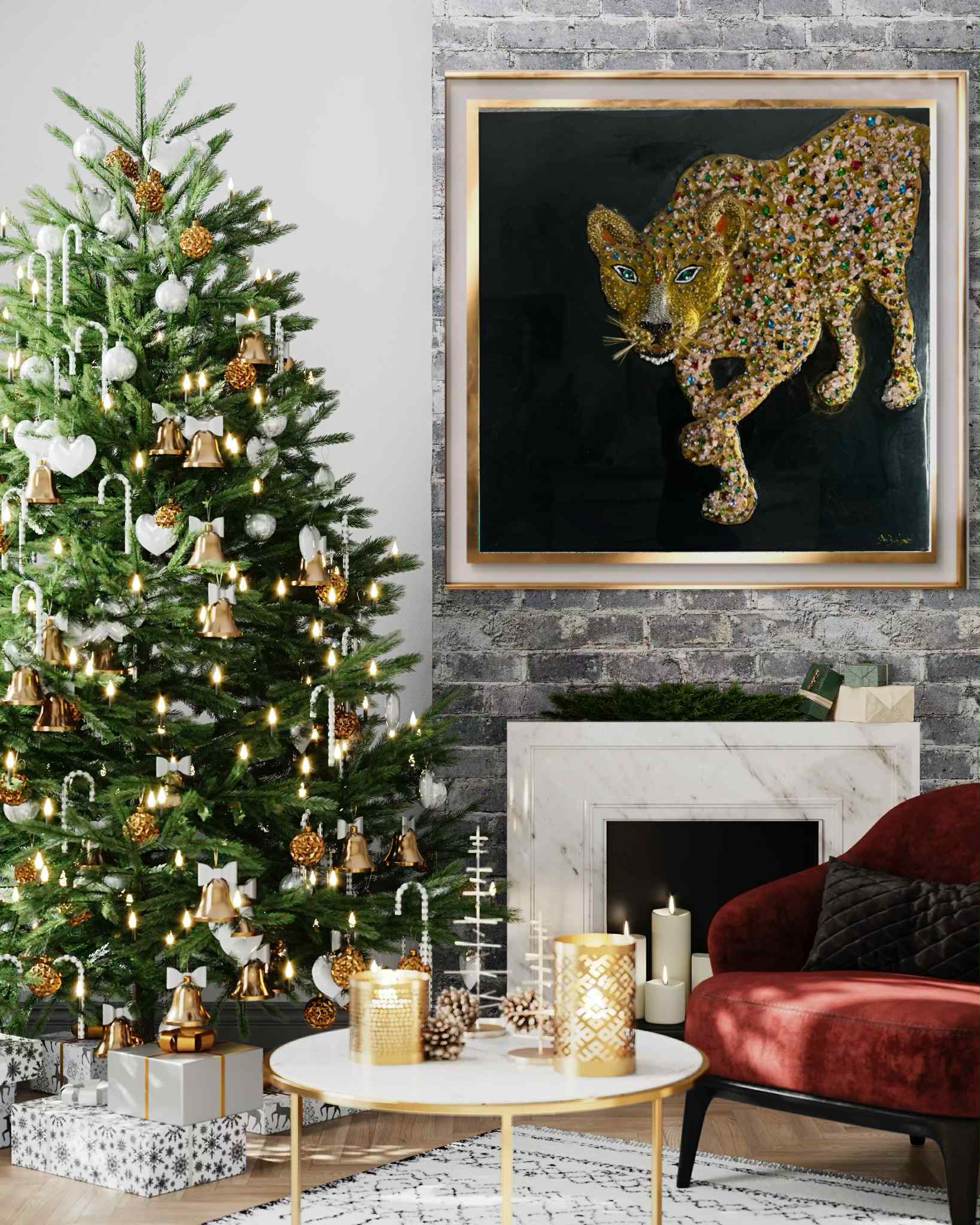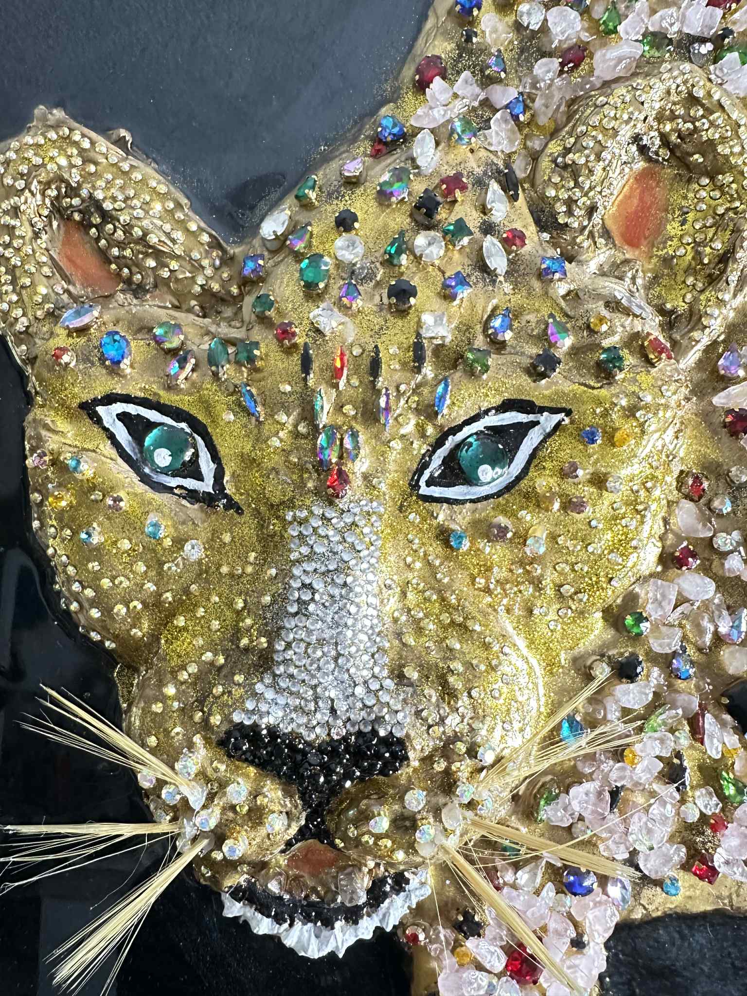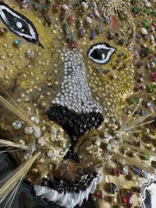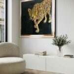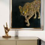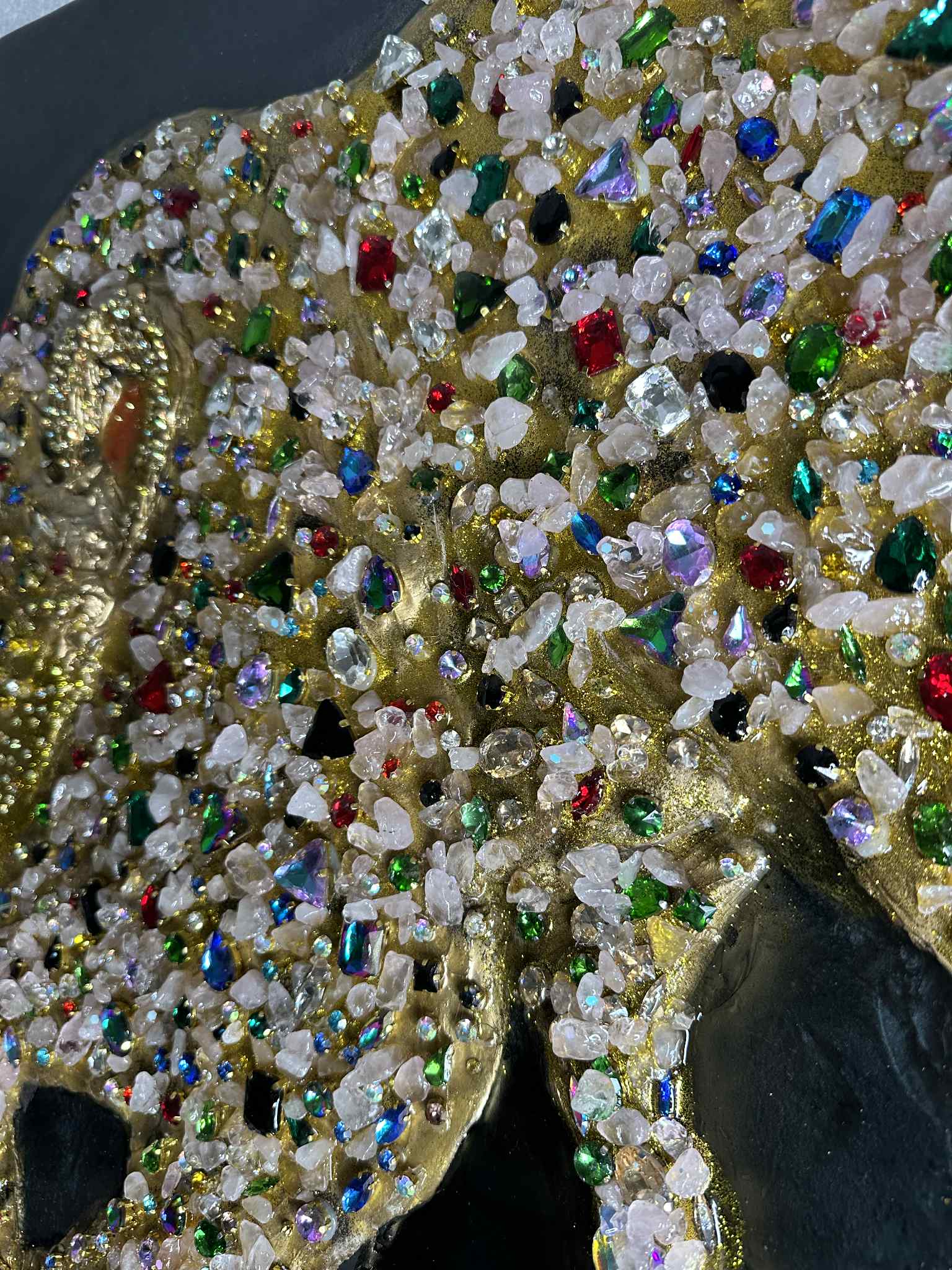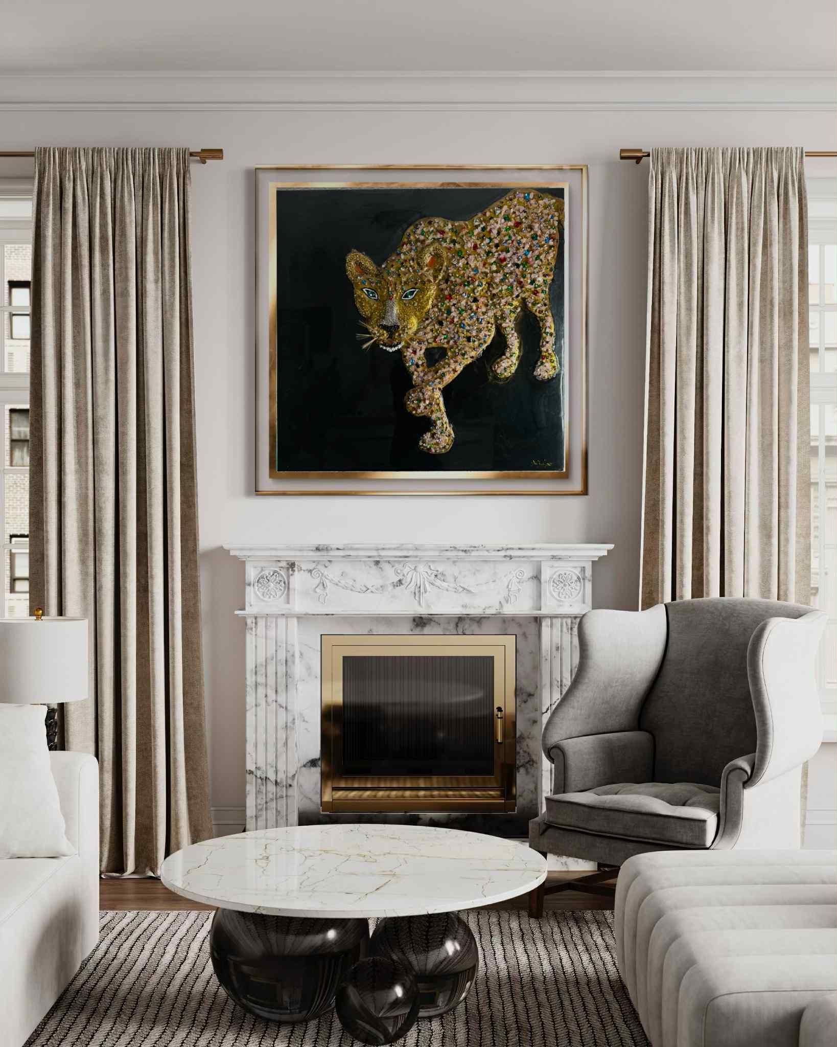 Unleash the spirit of the wild with ” Jewel Leopard”, an extraordinary resin art sculpture that blends power, elegance, and luxury. This 3D mixed-media artwork features a golden leopard encrusted with colorful gemstones and natural quartz teeth, symbolizing strength, resilience, and raw beauty.