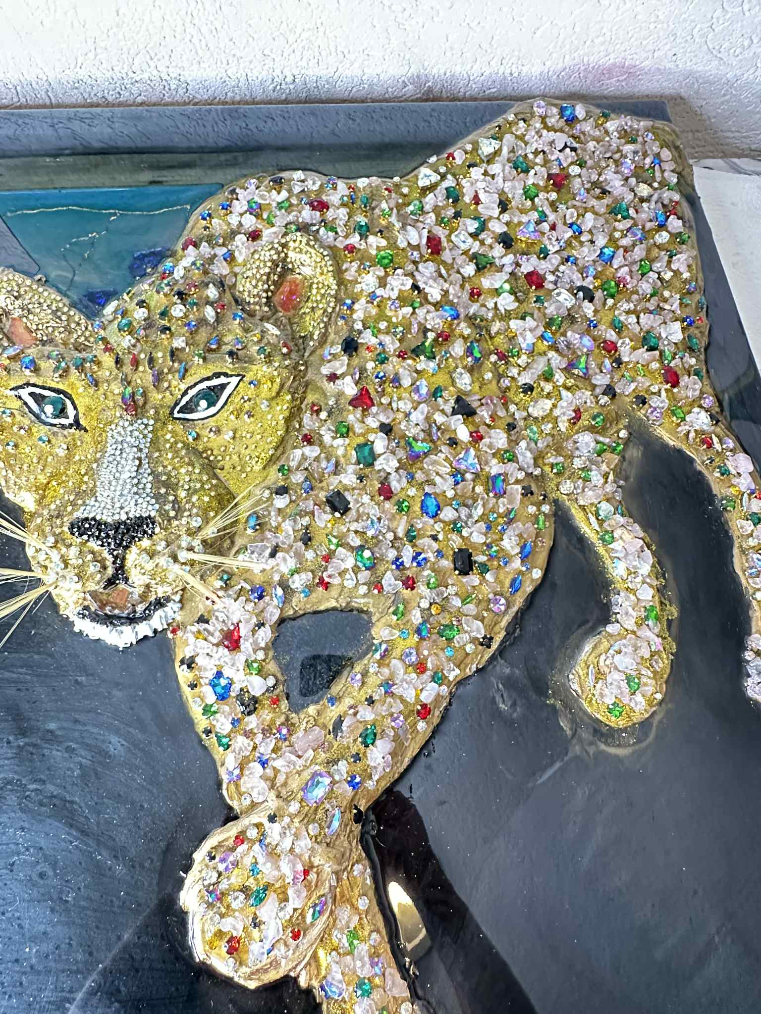 Set against a deep black epoxy background, the sleek, high-gloss finish enhances the vibrancy of the gemstones, making the leopard appear as if it’s leaping out of the canvas.