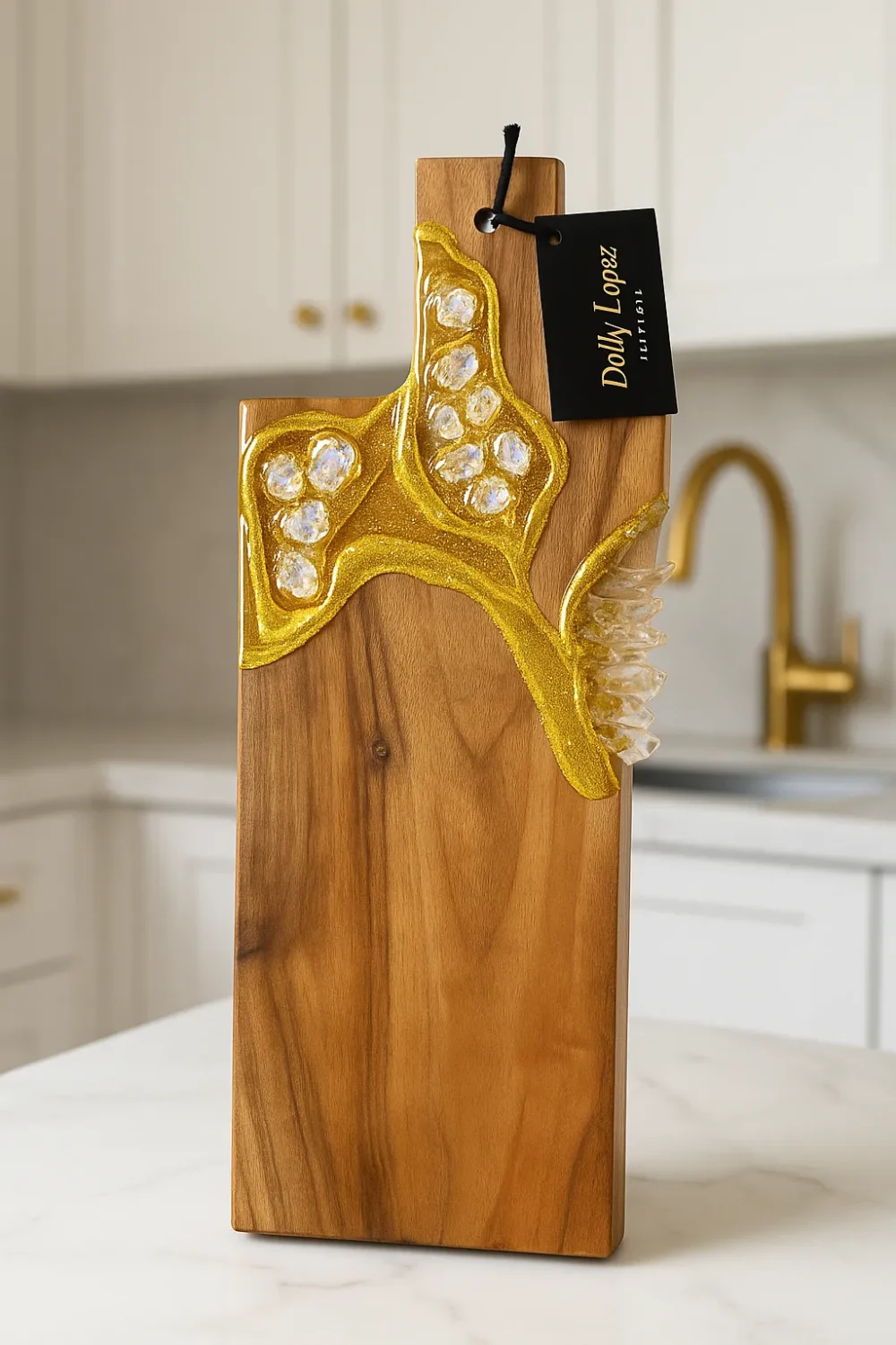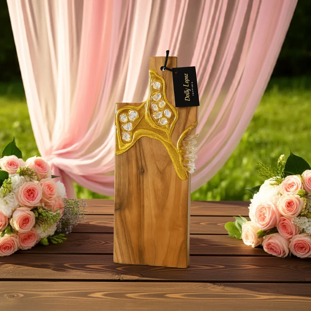 Bring a touch of elegance to your table with this stunning Gold Metallic Acacia Wood Cutting board by Dolly Lopez Art.