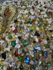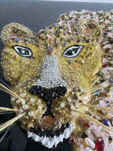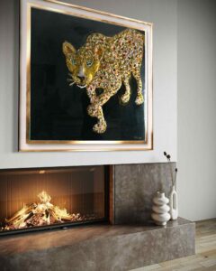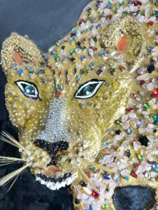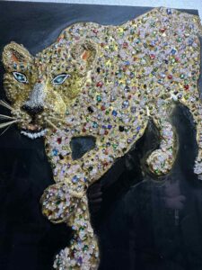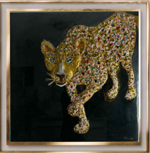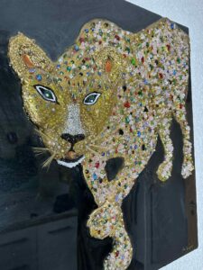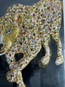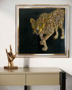 Unleash the spirit of the wild with ” Jewel Leopard”, an extraordinary resin art sculpture that blends power, elegance, and luxury. This 3D mixed-media artwork features a golden leopard encrusted with colorful gemstones and natural quartz teeth, symbolizing strength, resilience, and raw beauty.