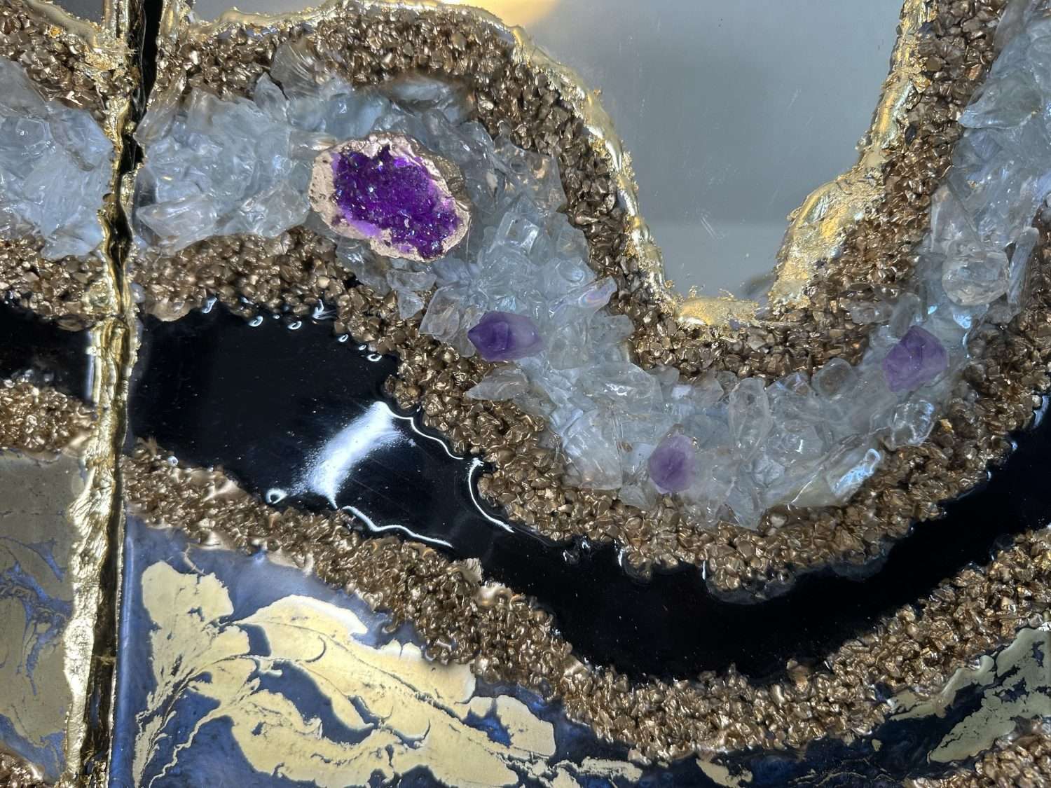SKU DL-CGA-2025-08 Category CRYSTAL -GEODE ART Tags agate, amethyst, dolly lopez art, epoxy queen, geode art, healing crystals, luxury home decor, mixed media, quartz, resin artist, spiritual crystals