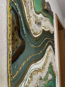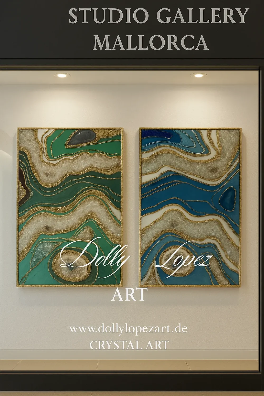 I’m proud to share that my cherished River Series—a captivating collection of blue and green quartz crystal resin artworks—is now on display in a stunning gallery located in the heart of Palma de Mallorca. This beautiful space, curated and owned by Carmen Rueda, offers the perfect setting to experience the flowing energy and natural elegance of these unique geode-inspired pieces. Each artwork is a harmonious fusion of crystal, mineral, and resin, inspired by the movement of water and the calming power of nature.