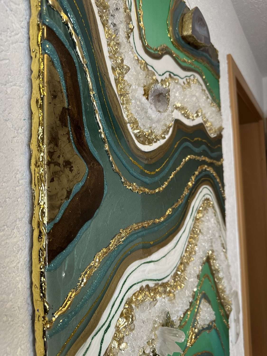 Elevate your interior with this stunning handmade geode wall art by Dolly Lopez. Featuring Green Amzonite, clear quartz, and 24K gold accents, it blends rich green tones with high-vibrational energy for clarity, confidence, and spiritual alignment.
