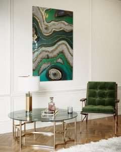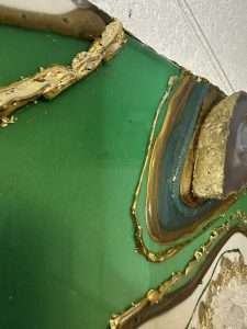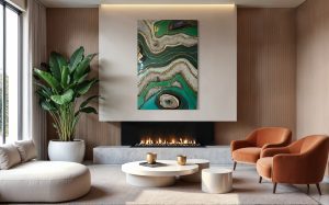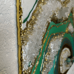 The Green Spiritual Amazonite artwork is a serene blend of mixed media and epoxy, centered around the calming energy of amazonite.