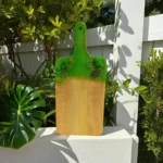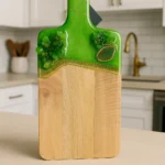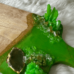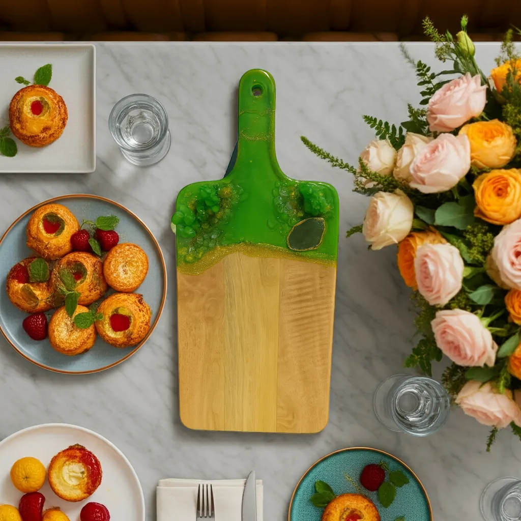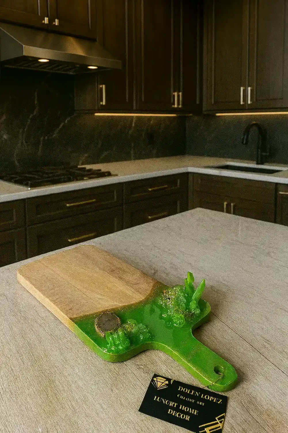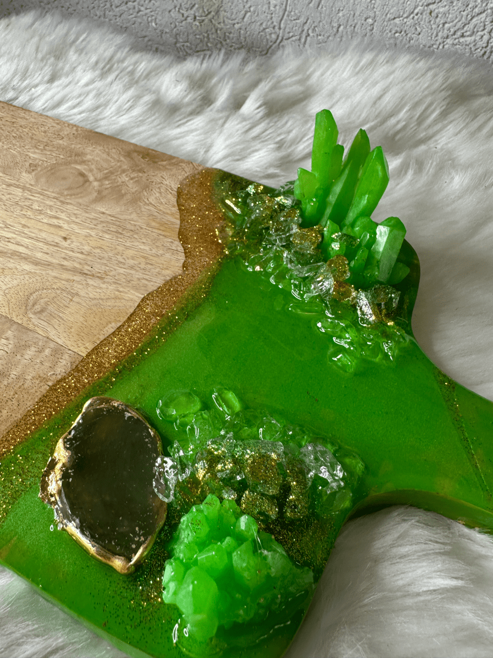 Handcrafted Luxury Green Glitter Acacia Wood CuttingBoard with Quartz Crystals and 24k Gold Leaf