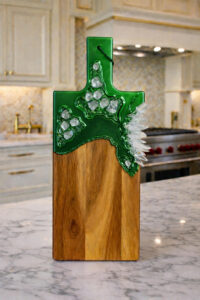 Handcrafted from high-quality acacai wood, this unique serving board features shimmering green metallic resin art, creating a luxurious, modern look.