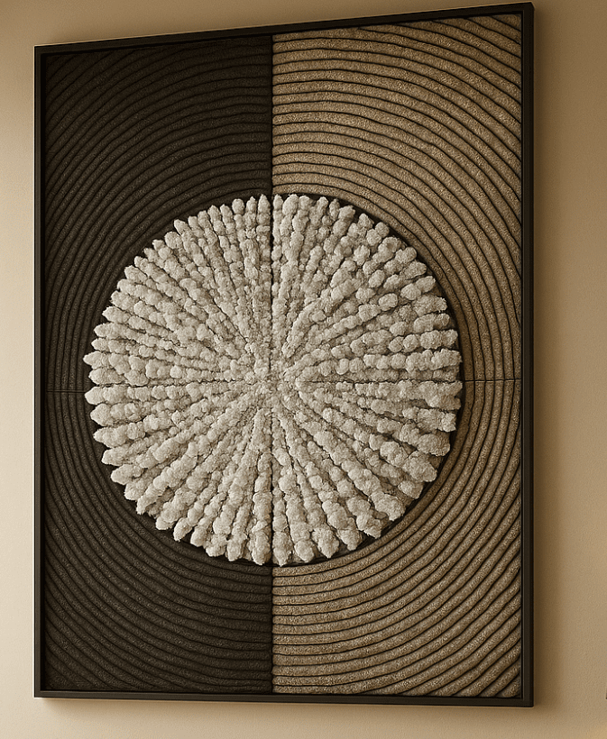 The circular composition unfolds in bold contrast—half textured with carved ripple patterns that echo waves of energy, the other adorned with over 100 hand-sculpted crystalline structures arranged in a perfectly symmetrical bloom. Finished in shimmering silver and deep matte black tones, this piece is both a visual statement and a symbol of balance, duality, and transformation.