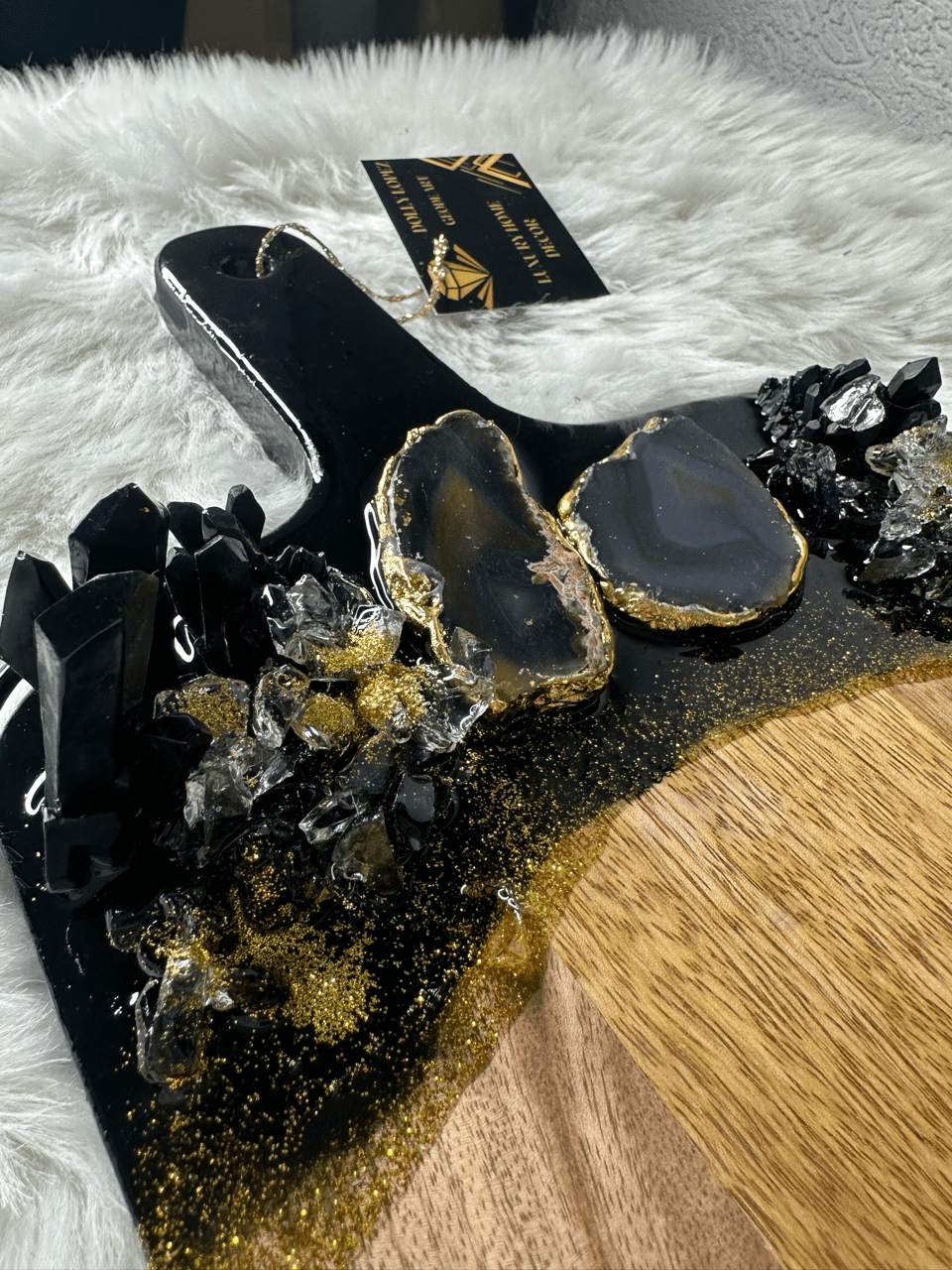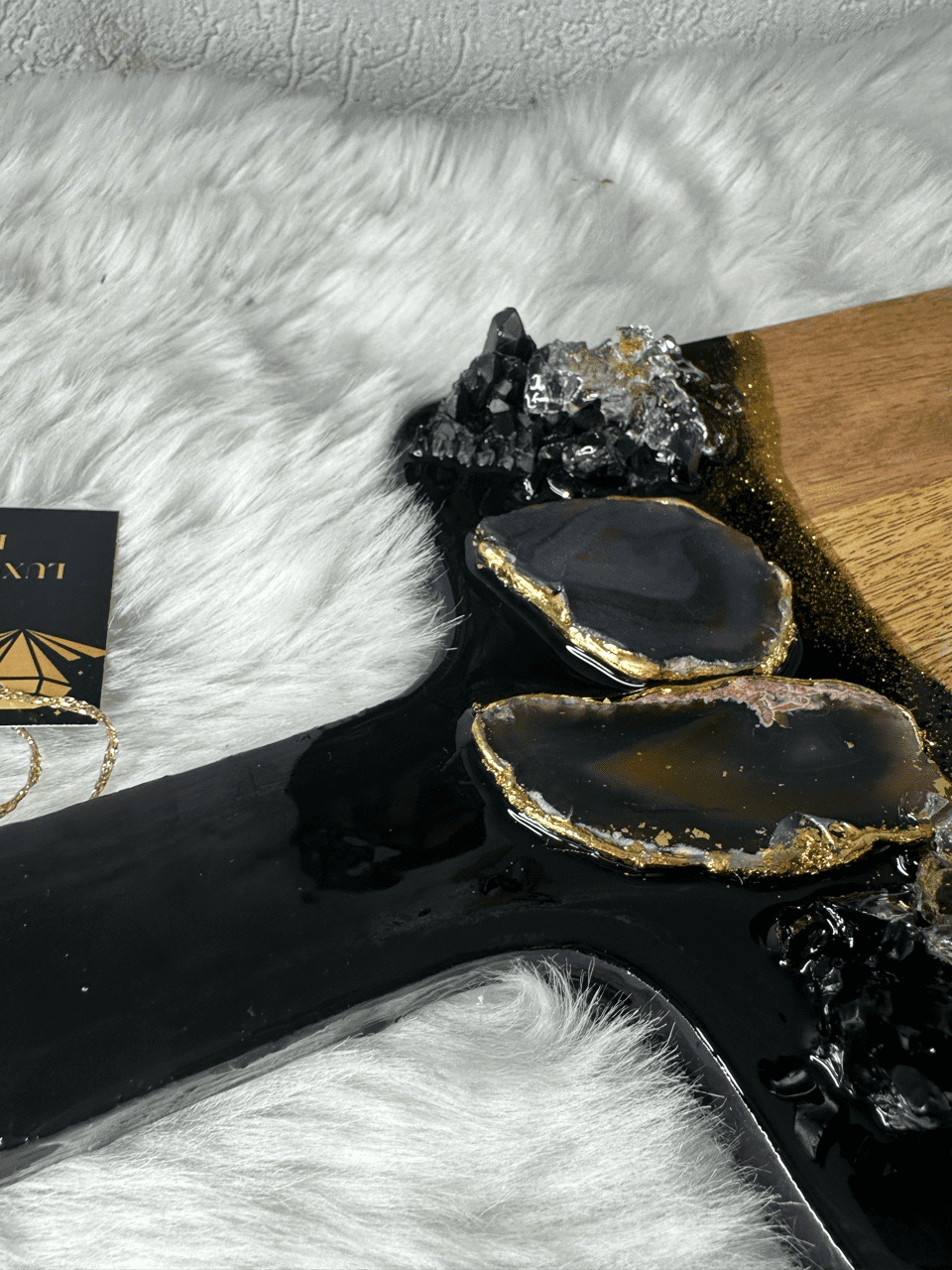 It features Quartz crystals – 2 Agate slices in beige with 24 k gold leaf on the side and radiant fireglass to resemble crushed crystals. This cutting board is one of a kind, and cannot be replicated.