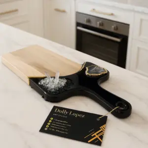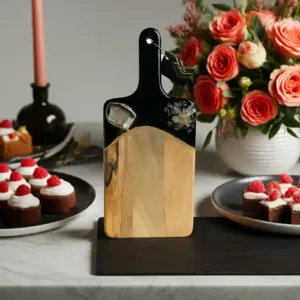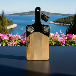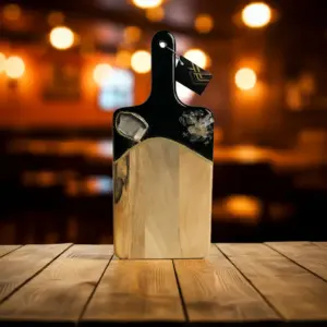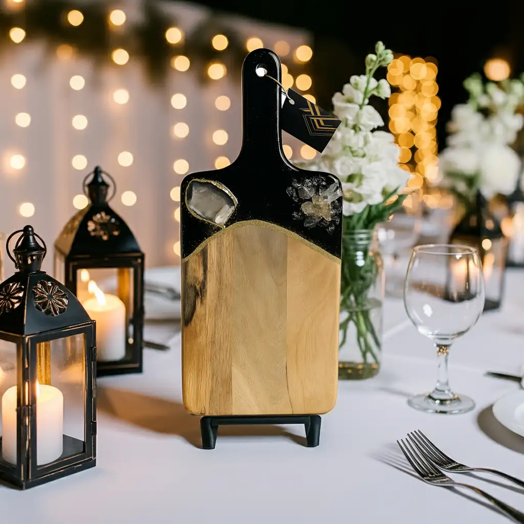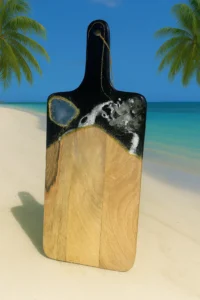 This beautiful Noir and gold cutting board is a luxury piece of functional art for the kitchen. Made from acacia wood with 3 layers of epoxy resin.