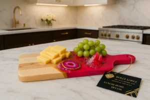 This cutting board is one of a kind, and cannot be replicated. This serving board is meant to entertain! Place crackers, olives, cheese, meats etc. on the bare wood section. When not in use, this board can be showcased as a work of art upright on a stand, rested against the backsplash, or displayed flat with your favorite candles or home decor