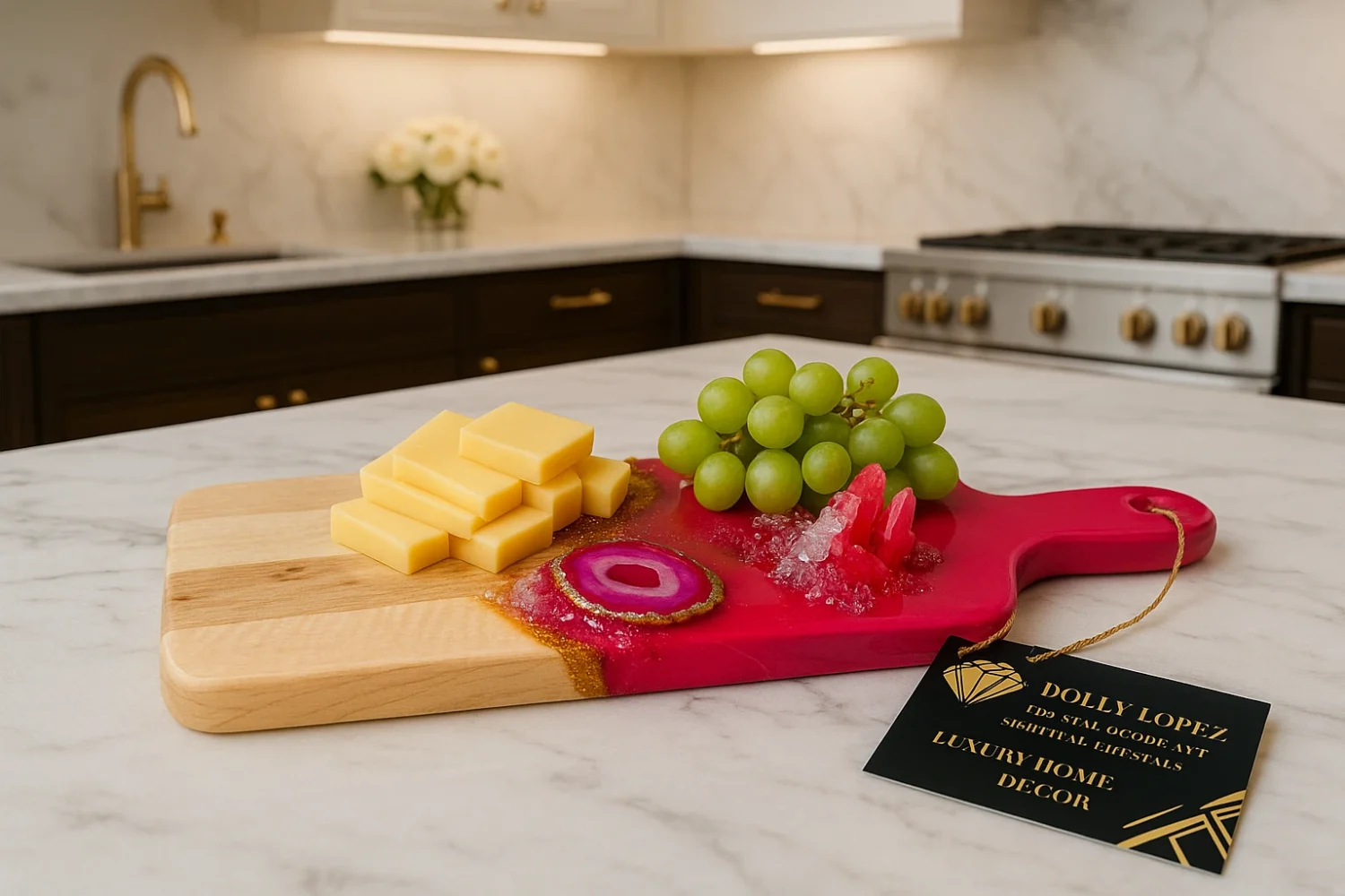 It features  Quartz  crystals – Agate slices in pink with 24 k gold leaf on the side  and radiant fireglass to resemble crushed crystals. This board is one of a kind, and cannot be replicated.