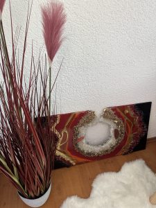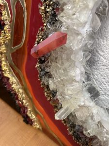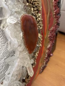 Epoxy resin, spray paint, glitter, colored pigments and ink, texture builder, and fire glass bring this piece to life. luxury piece displays plenty of texture,Agate and quarz crystals inspired by Ruby creating extraordinary 3D art from every angle.