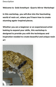 Join me for a creative and inspiring session where you’ll learn to transform resin into beautiful GOLD AMETHYST CRYSTAL MIRROR like works of art.