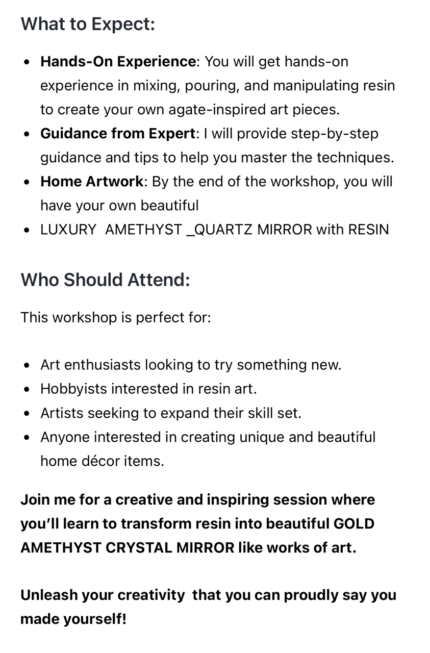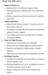 - Hands-On Experience: You will get hands-on experience in mixing, pouring, and manipulating resin to create your own inspired art pieces.