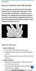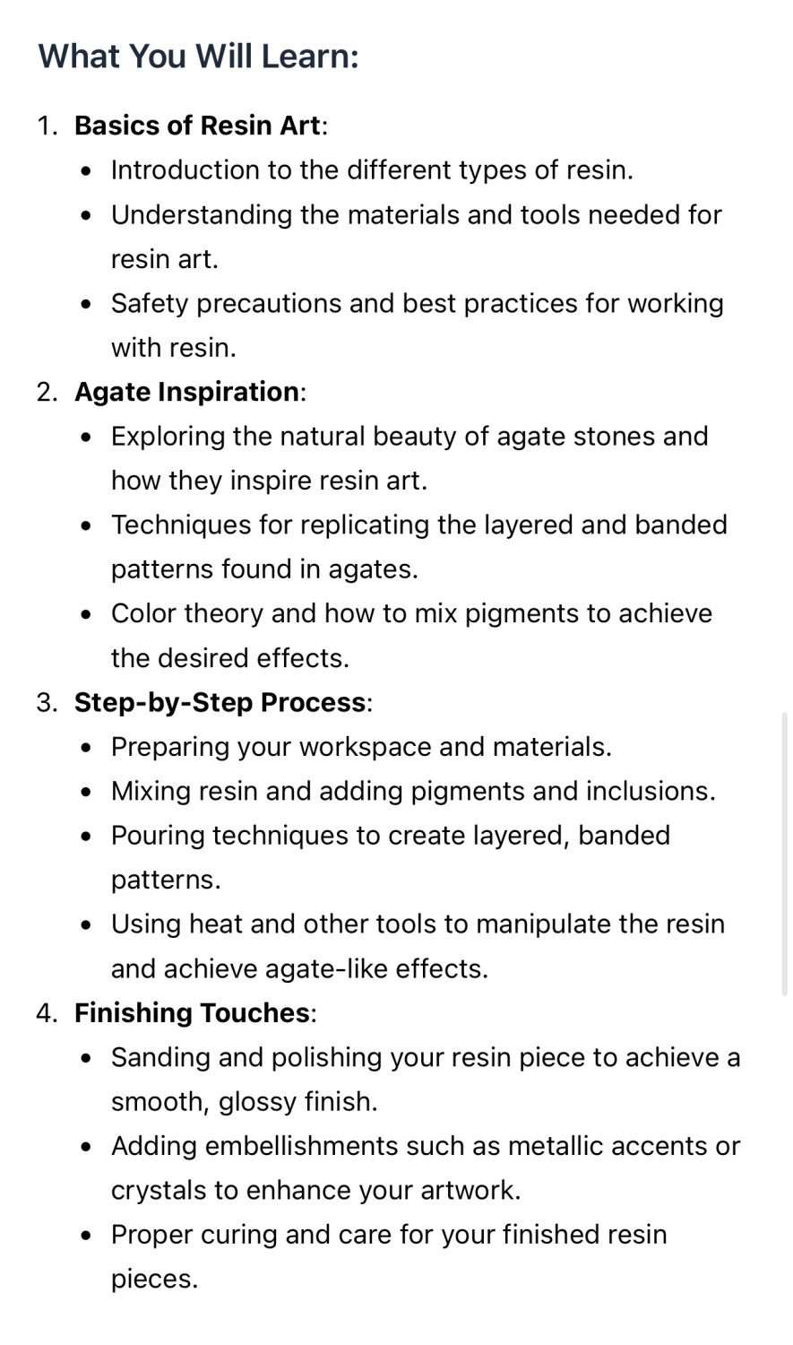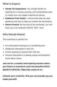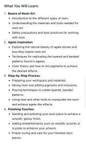 - Hands-On Experience: You will get hands-on experience in mixing, pouring, and manipulating resin to create your own agate-inspired art pieces.