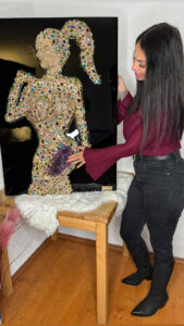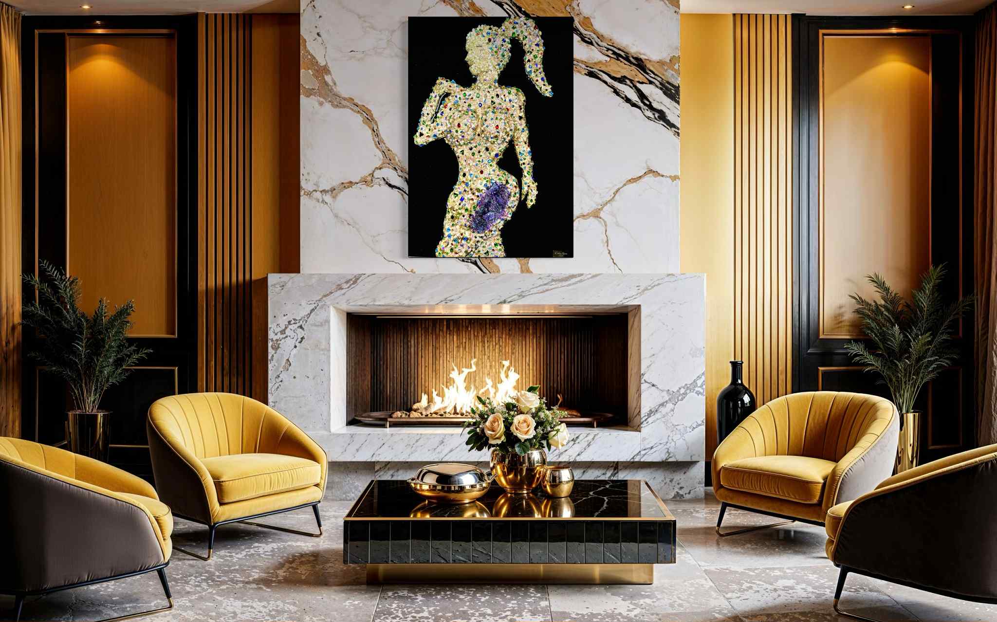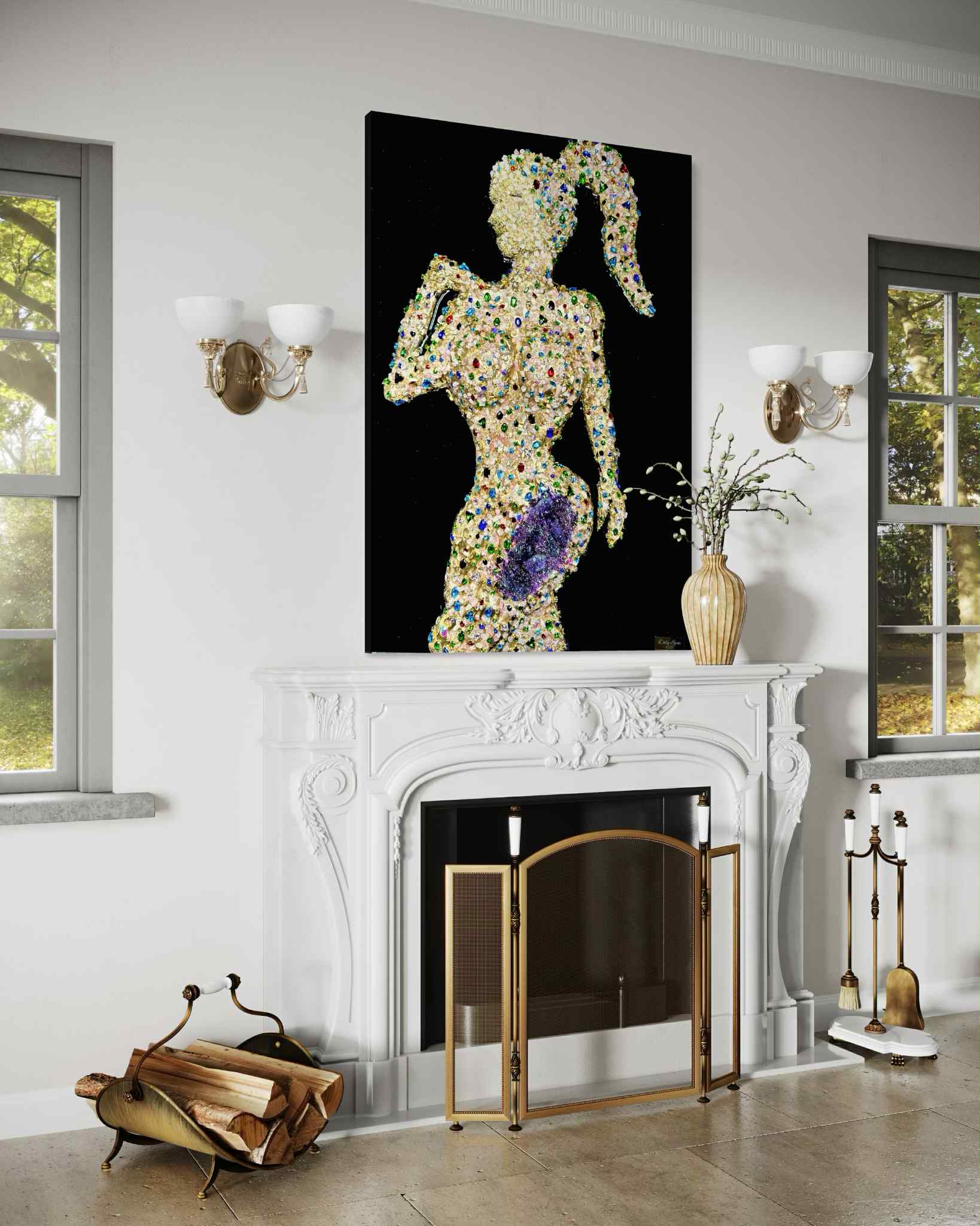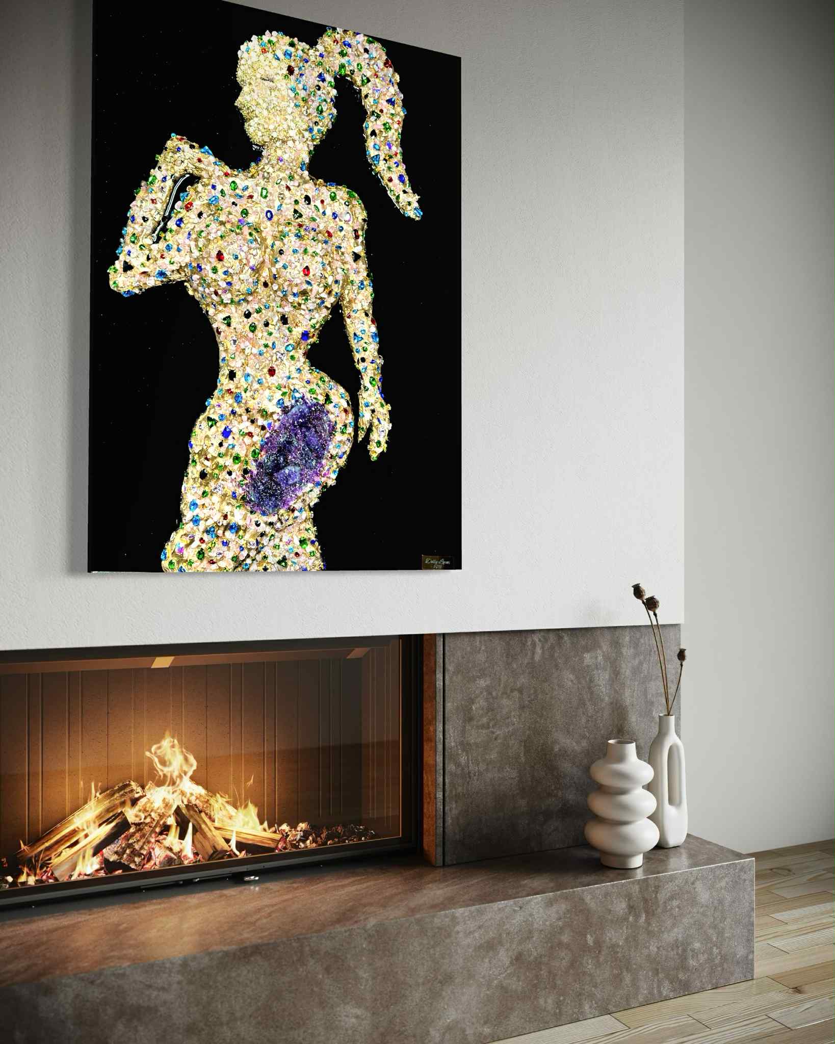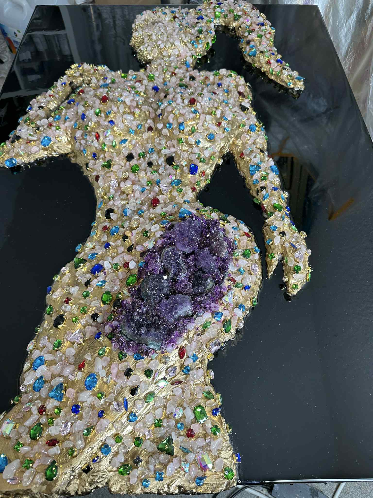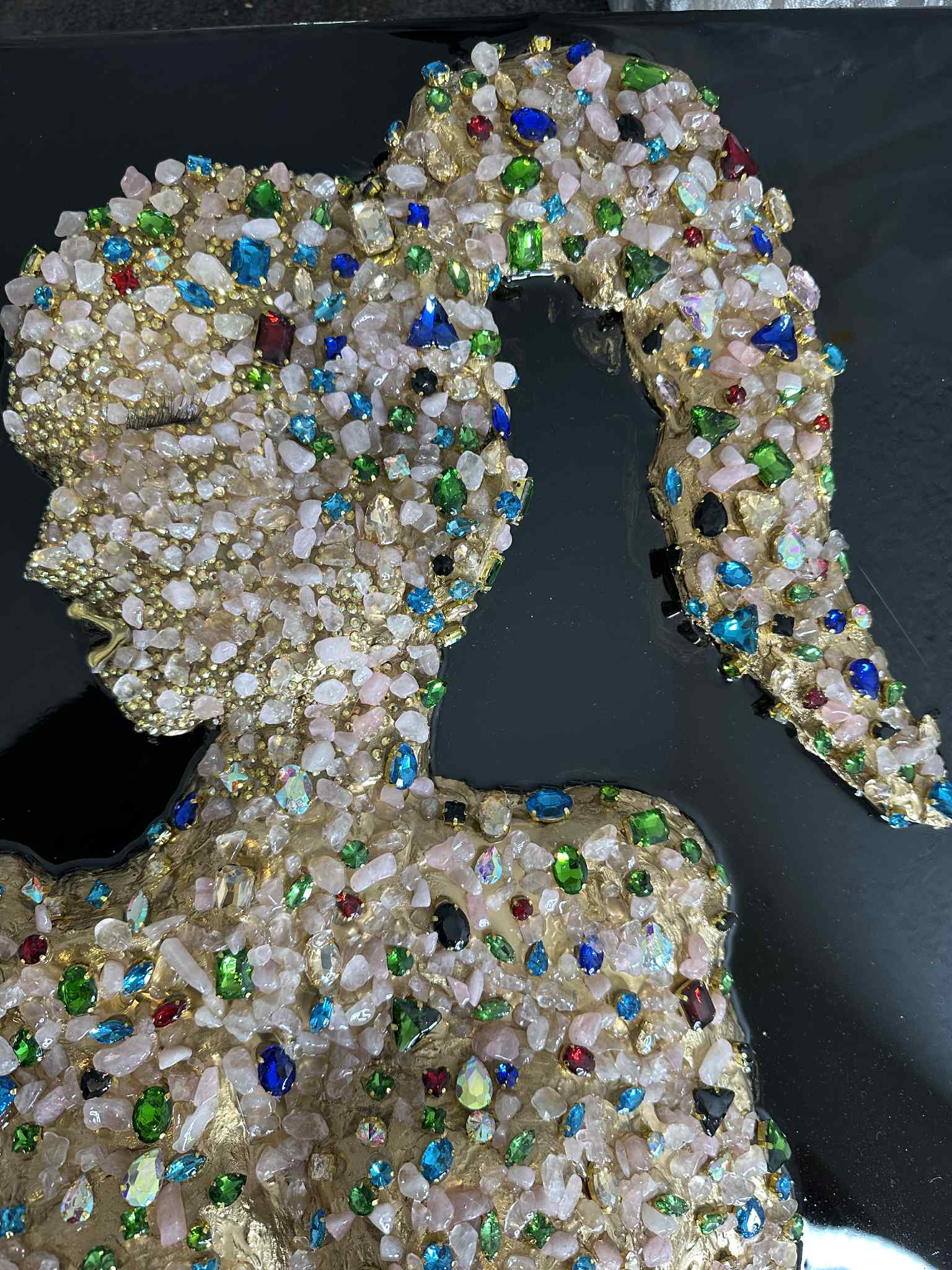 This sensual feminine silhouette is handcrafted on a deep black, high-quality epoxy resin background, creating a mirror-like, luxurious finish that allows the crystals to shine with maximum intensity.
