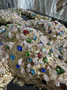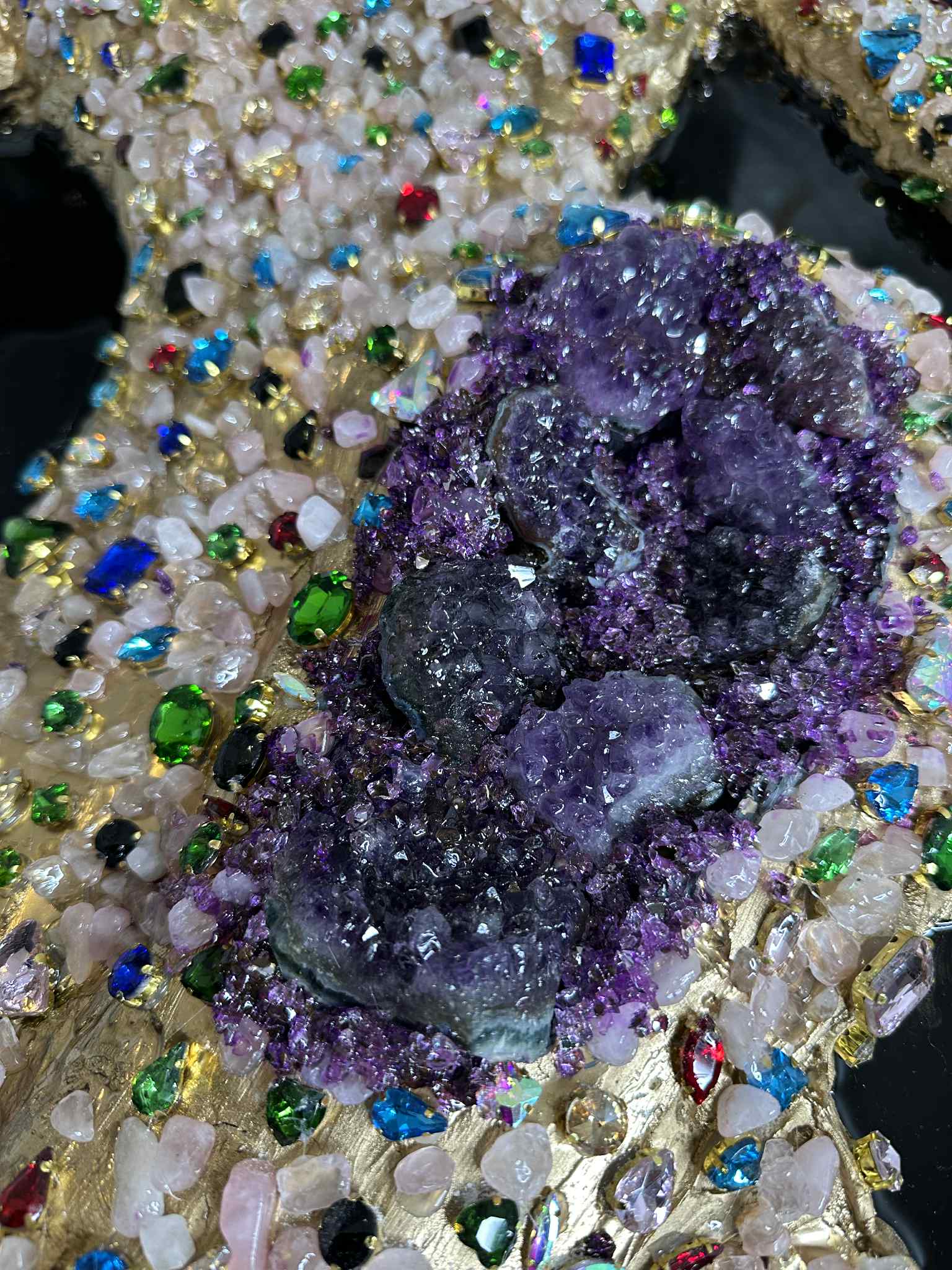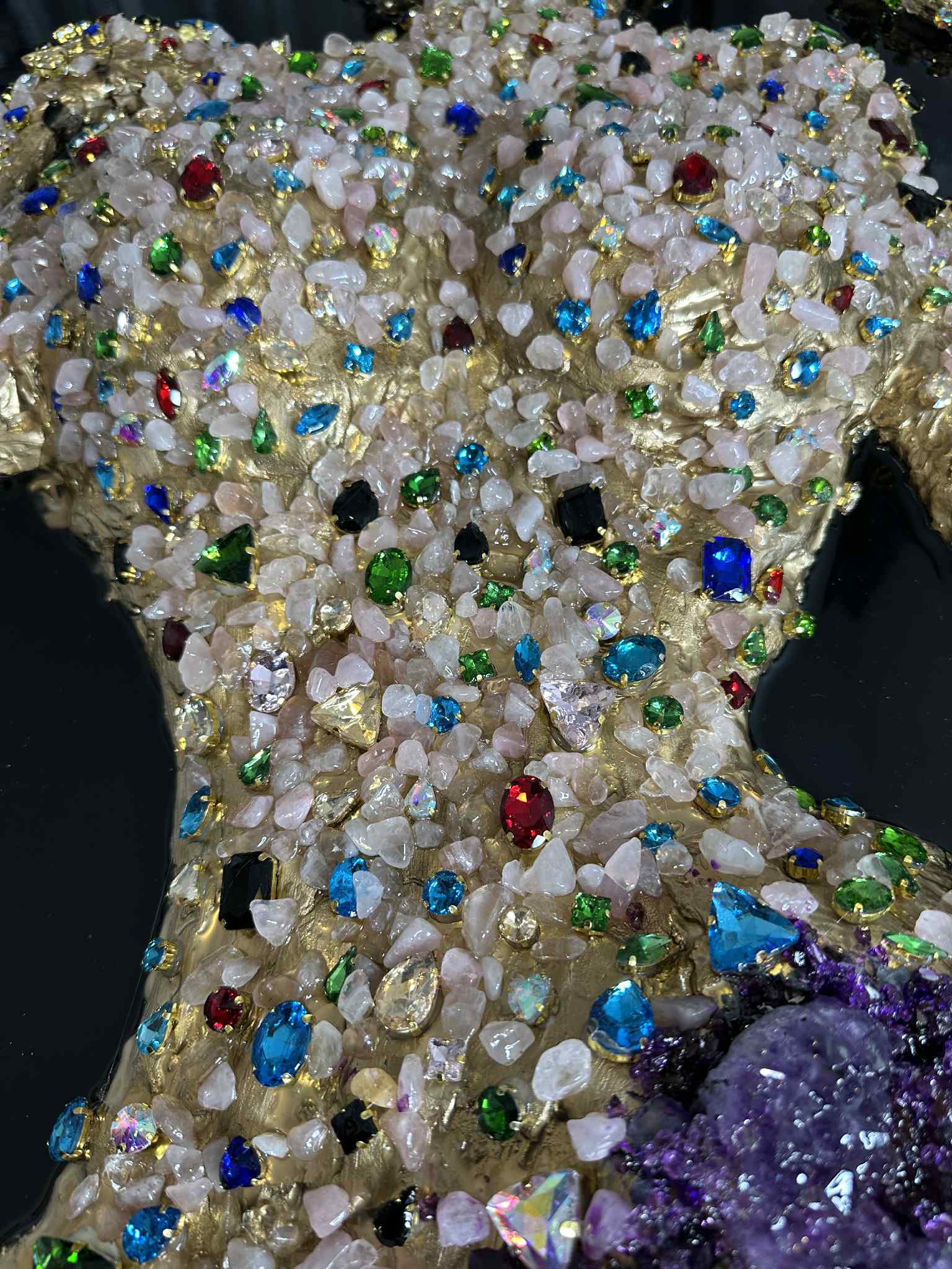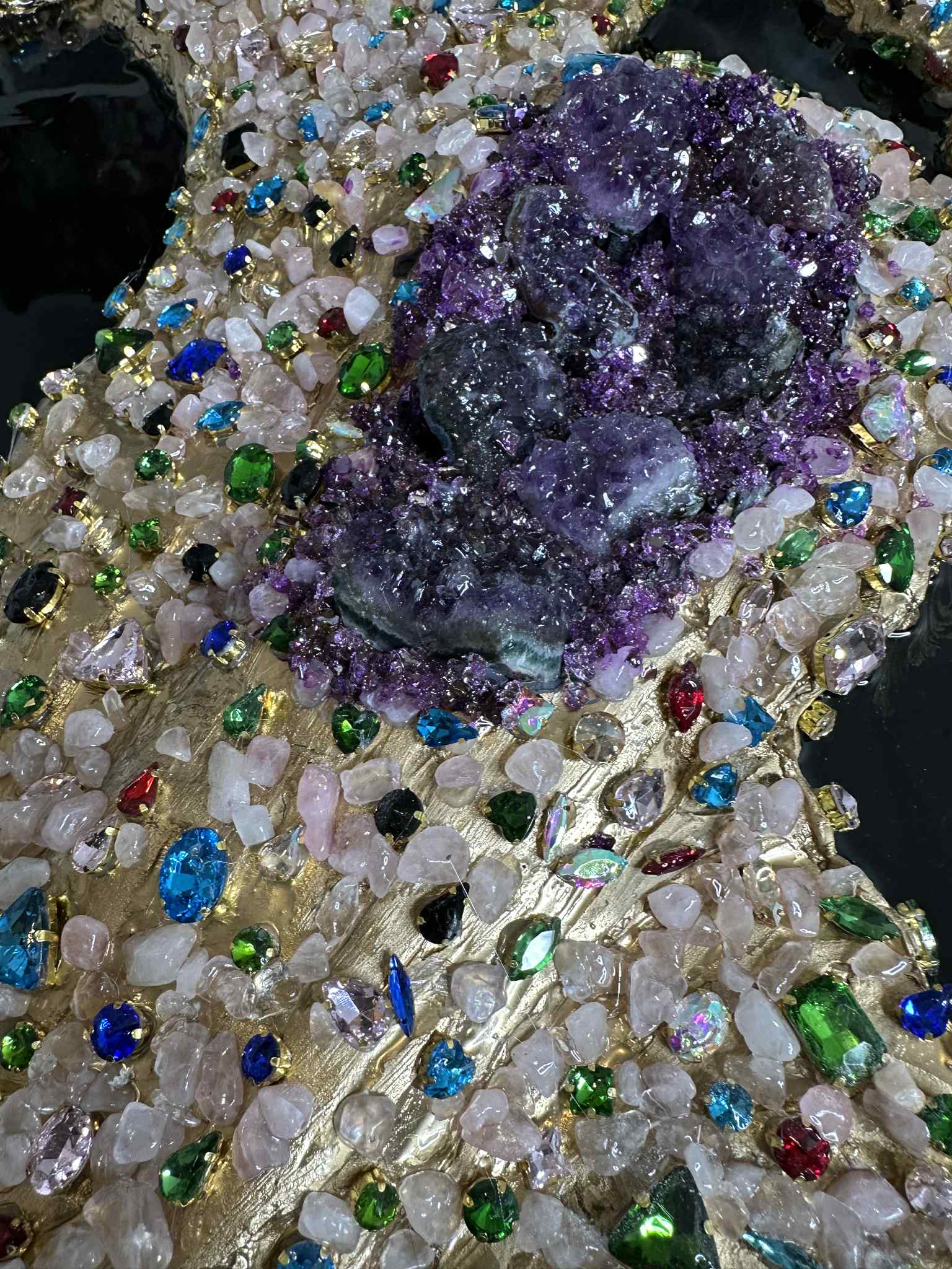 The artwork is enriched with many additional crystals in multiple colors, carefully placed to enhance the 3D texture and energetic vibration of the piece. Each crystal is hand-selected, making this artwork truly one of a kind.