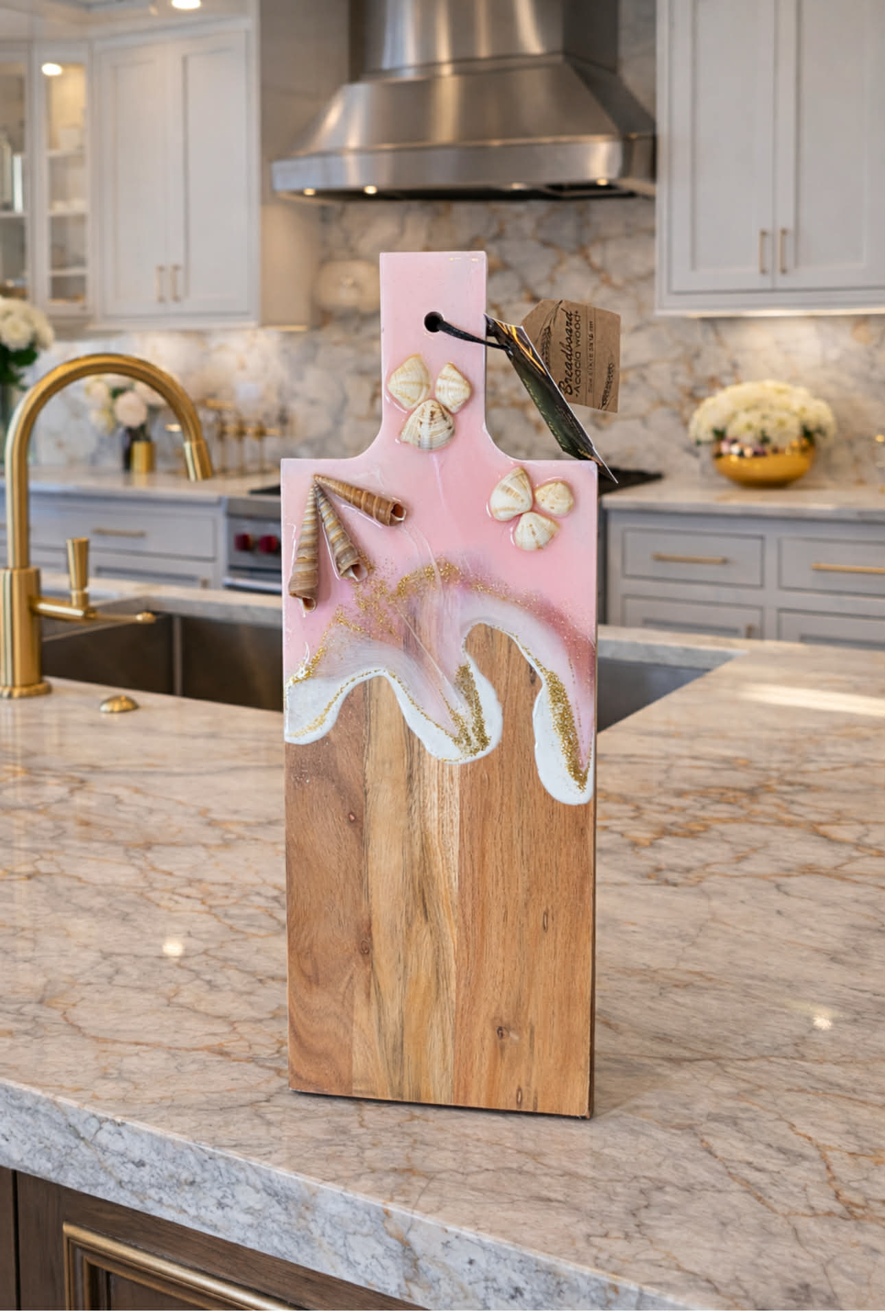 Handcrafted from high-quality acacai wood, this unique serving board features shimmering Rose Sea Muschel art, creating a luxurious, modern look.