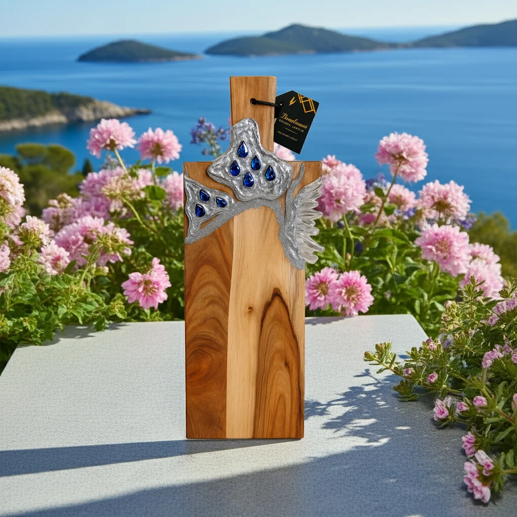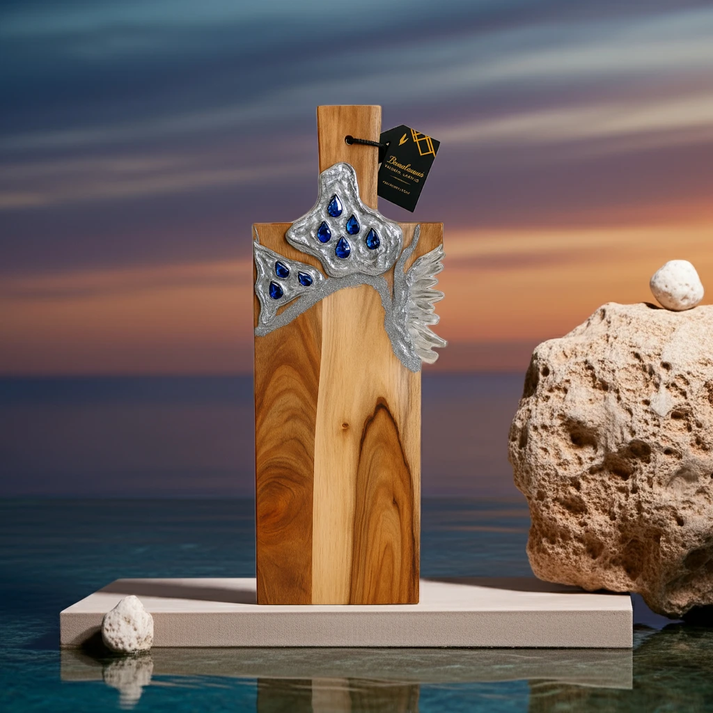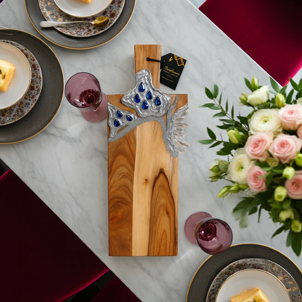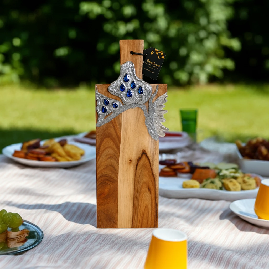 Handcrafted from high-quality acacai wood, this unique serving board features shimmering silver metallic resin art, creating a luxurious, modern look.