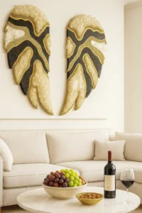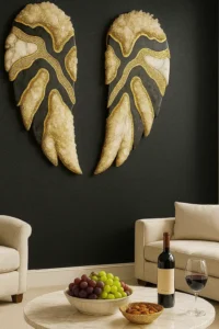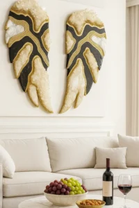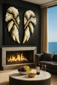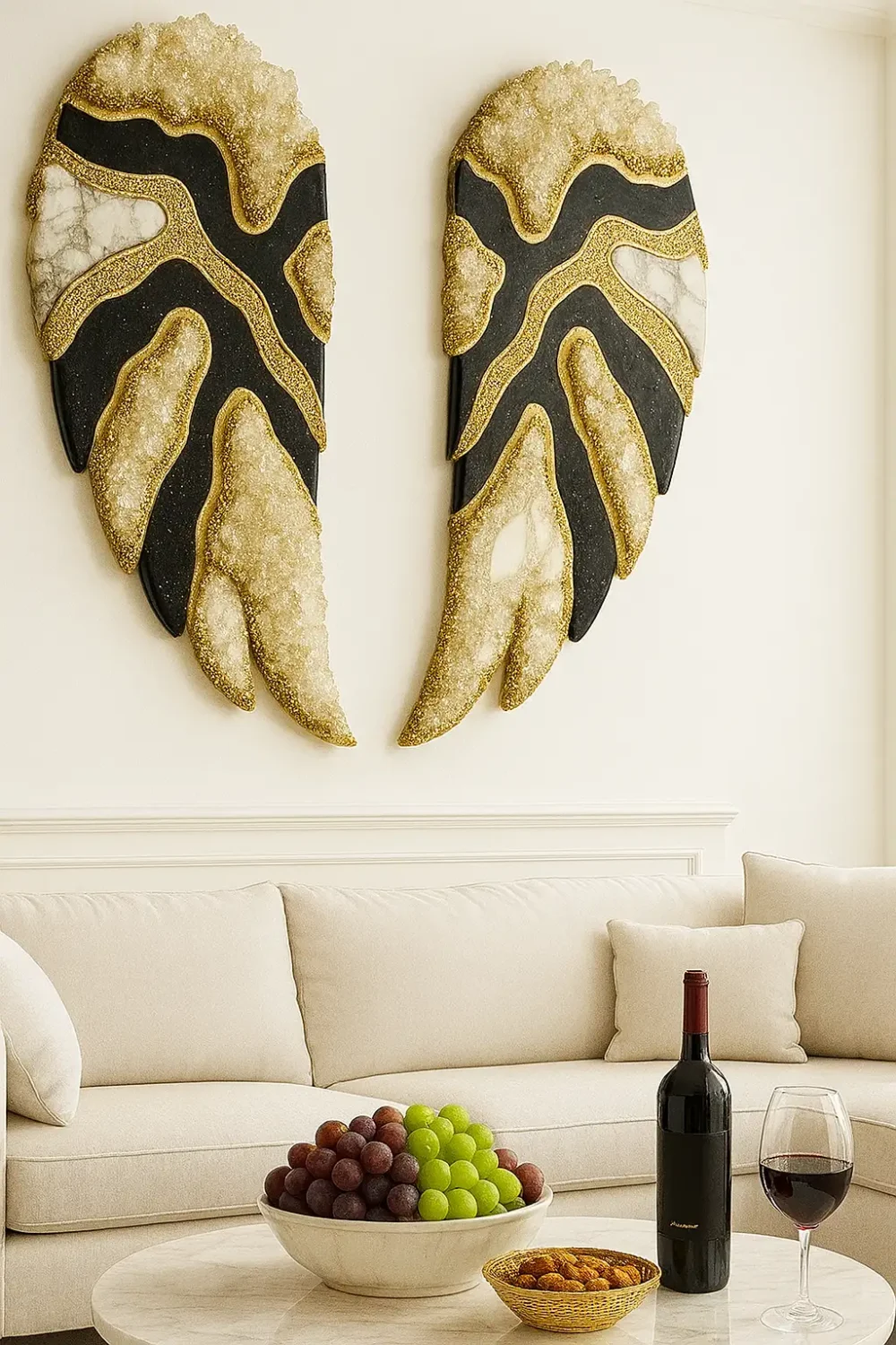 Angel wings symbolize divine protection, inner transformation, and elevation. The deep black resin grounds and empowers, while the bright white surfaces evoke purity, intuition, and spiritual clarity. 24K gold enhances prosperity, and quartz crystals amplify the artwork’s high-frequency energy.