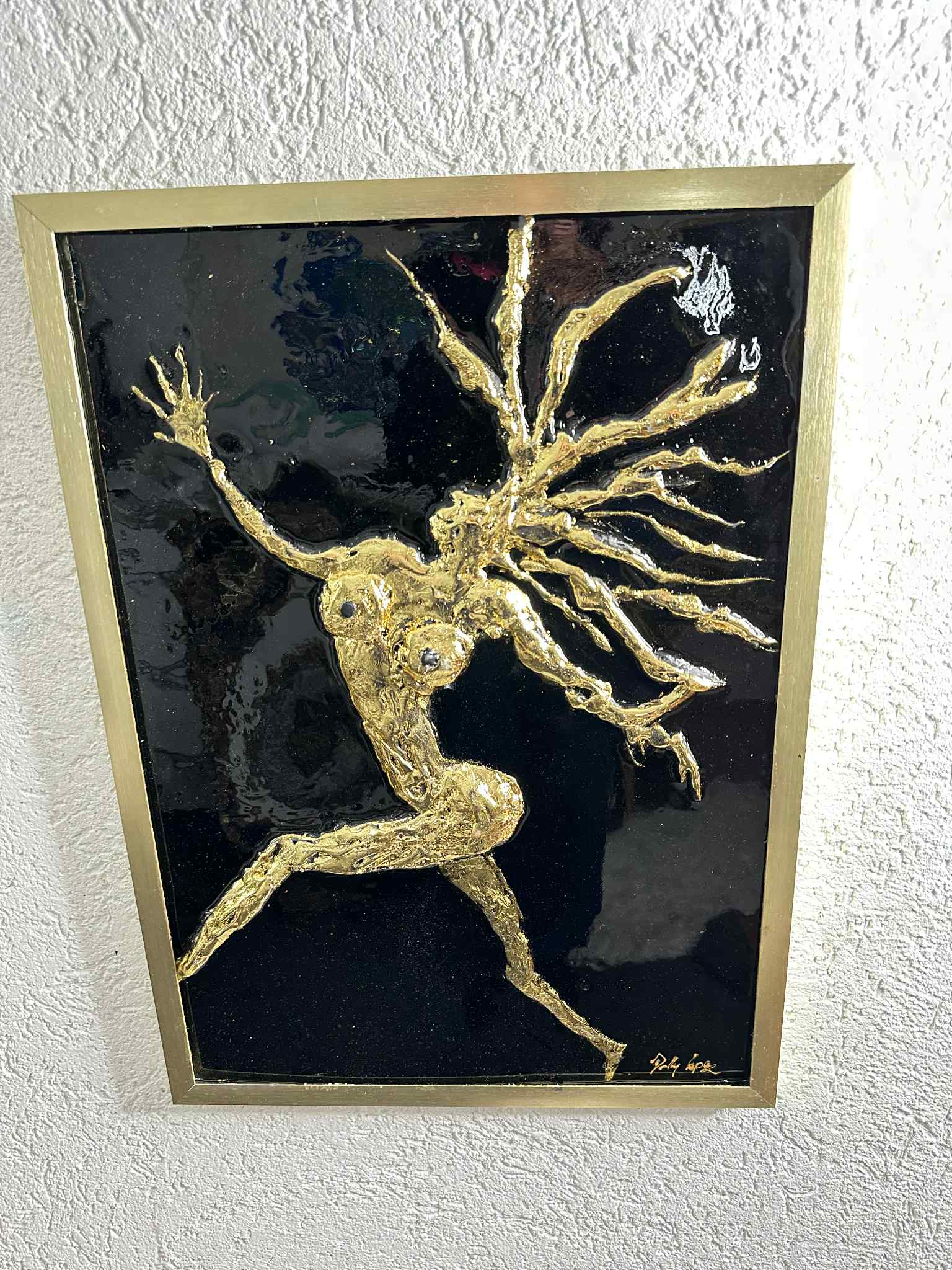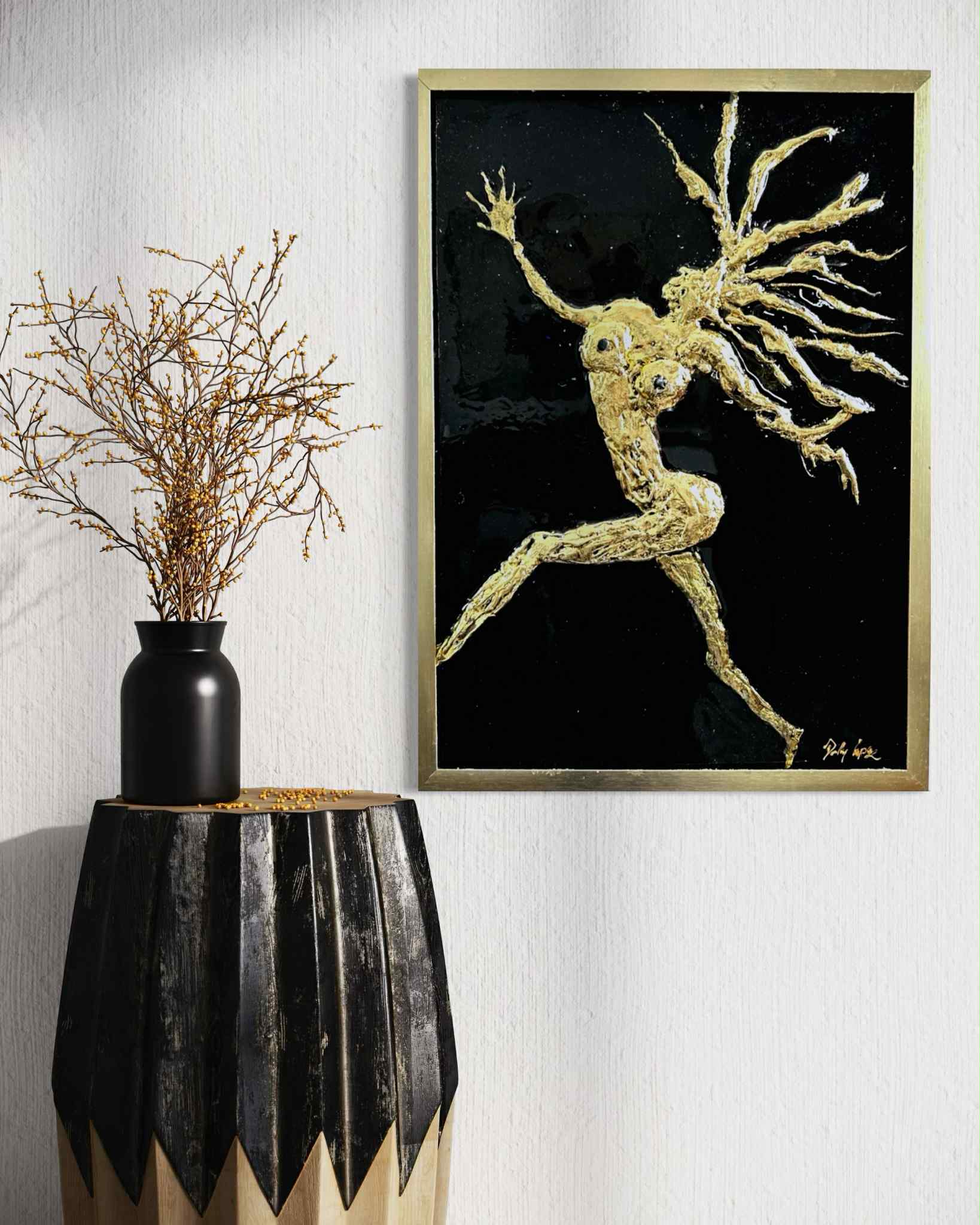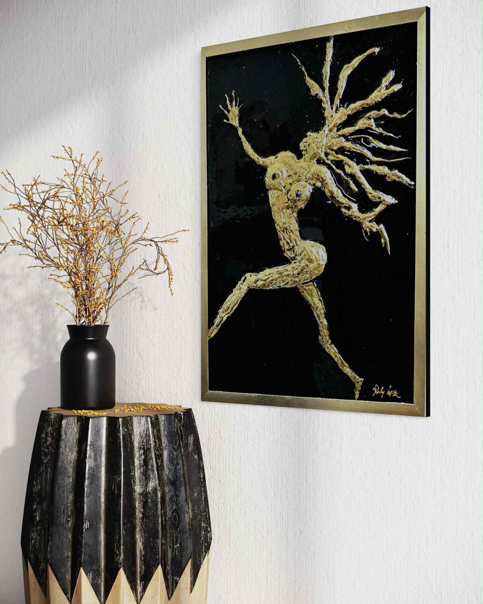 Crafted with striking 24K gold leaf and high-gloss resin, “Sun Dancer” by Dolly Lopez captures the raw beauty and celestial energy of the divine feminine in motion. This golden figure, suspended in an expressive leap, radiates strength, sensuality, and spiritual transformation.