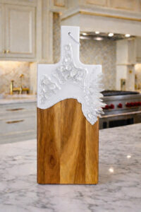 Bring a touch of elegance to your table with this stunningm Withe Metallic Acacai Wood Cutting Board by Dolly Lopez Art.