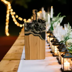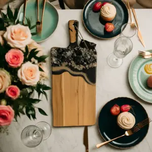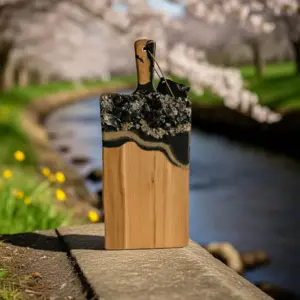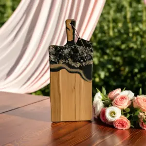 Made from acacia wood with 3 layers of epoxy resin. It features radiant fireglass to resemble crushed crystals. This board is one of a kind, and cannot be replicated.